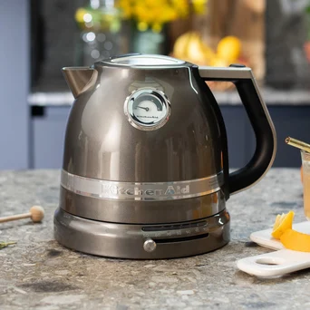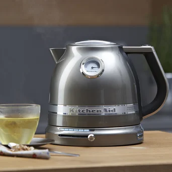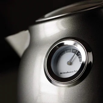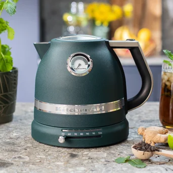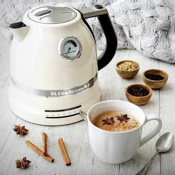 Miłośnikom dobrej herbaty spodoba się czajnik KitchenAid Arisan 1,5L, który ma funkcję ustawiania temperatury wody stosowną do rodzaju naparu. Dzięki temu np. otrzymamy doskonałą zieloną herbatę, która nie wymaga wrzątku, w odróżnieniu do czarnej. Podwójne ścianki czajnika utrzymują temperaturę wody dłużej, nawet gdy nie stoi już na swojej podstawie. Atrakcyjny w wyglądzie i kolorystyce, dobrze się zaprezentuje w kuchni, będąc zawsze gotowym być świadkiem kolejnej serii ploteczek przy herbacie. Zobacz przepis na rozgrzewający czaj z przyprawami >>