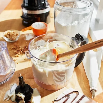 Wielofunkcyjny malakser 1,7 KitchenAid ma nową, kompaktową konstrukcję, która umożliwia szybki montaż, łatwiejsze używanie oraz utrzymanie w czystości i oszczędność miejsca, dzięki możliwości przechowywania akcesoriów bezpośrednio w jego misie roboczej.