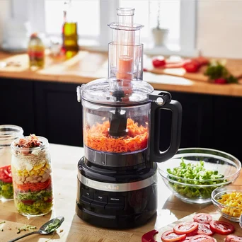 Teraz może być zawsze pod ręką, gdy trzeba szybko przerobić produkty na drobne i grubsze wiórki czy na plasterki, albo uzyskać gładką pastę kanapkową i warzywne purée, a czasem szybko wyrobić ciasto na kruchy spód do małej tarty lub ciasto na mufinki. Szczelna misa robocza umożliwia przetwarzanie płynów i myje się w mgnieniu oka, przez miksowanie wodą z kroplą detergentu.