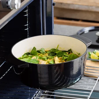 Czarny emaliowany garnek żeliwny o pojemności 3,3L to połącznie elegancji, wyrafinowanego stylu i wysoko cenionych właściwości termicznych żeliwa. Idealnie sprawdzi się przy smażeniu, duszeniu i długotrwałym gotowaniu na małym ogniu oraz pieczeniu. Dzięki odporności na temperaturę do 260ºC może być także używany w piekarniku. Kolor garnka idealnie pasuje do miksera planetarnego KitchenAid w kolorze Onyx Black. W komplecie także solidna żeliwna pokrywka z wygodnym uchwytem ze stali nierdzewnej. Nie nadaje się do mycia w zmywarce.