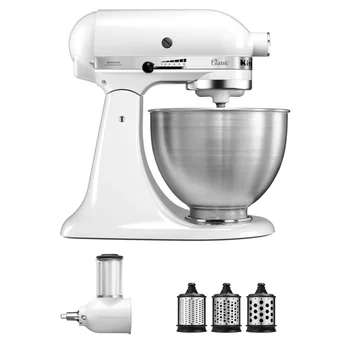 Do każdego miksera Classic w kolorze białym lub czarnym maszynka do tarcia i szatkowania (5KSMVSA) oraz dodatkowe tarki (5KSMEMVSC) gratis. Czas trwania akcji promocyjnej jest ograniczony. Zobacz także inne zestawy promocyjne z mikserem Classic >>
