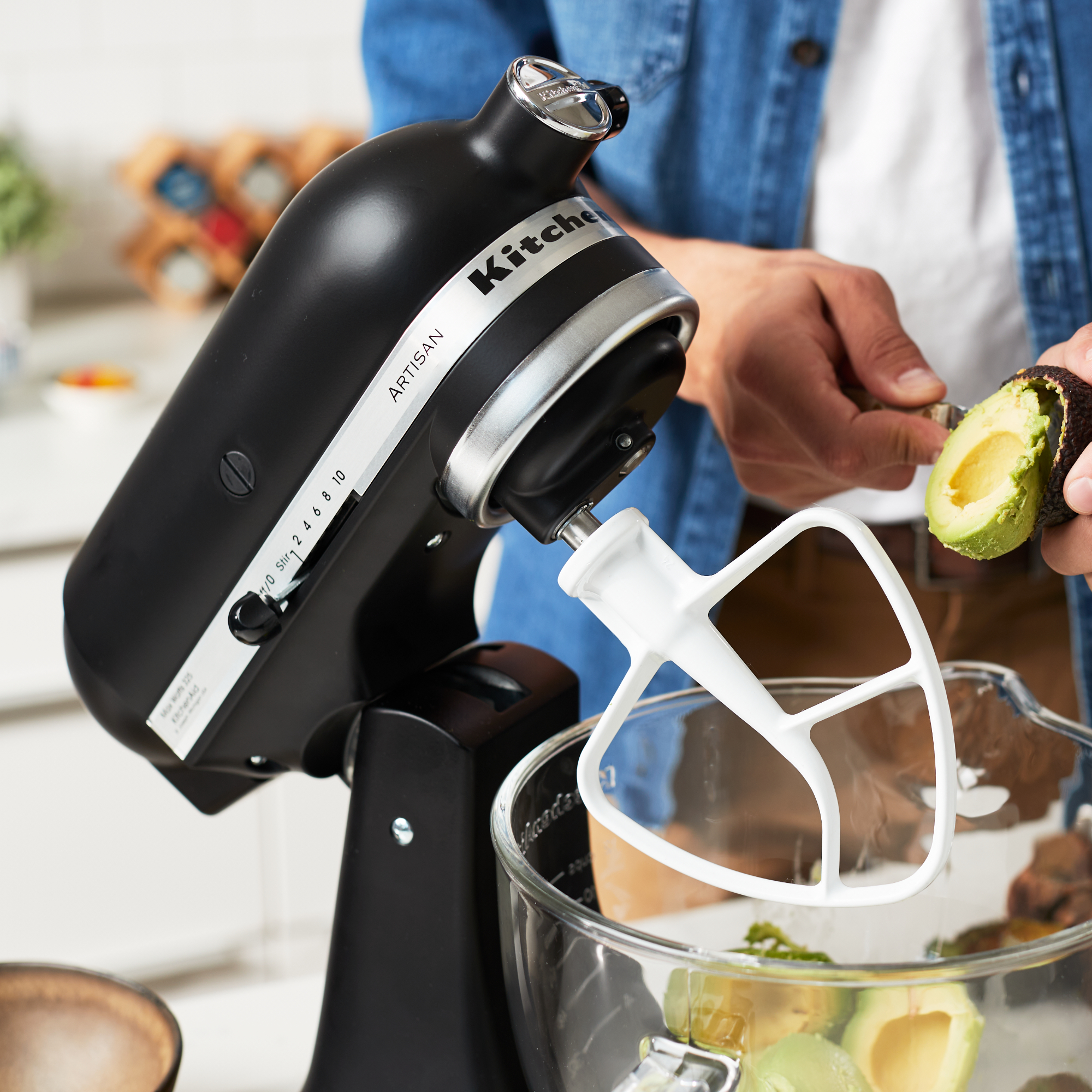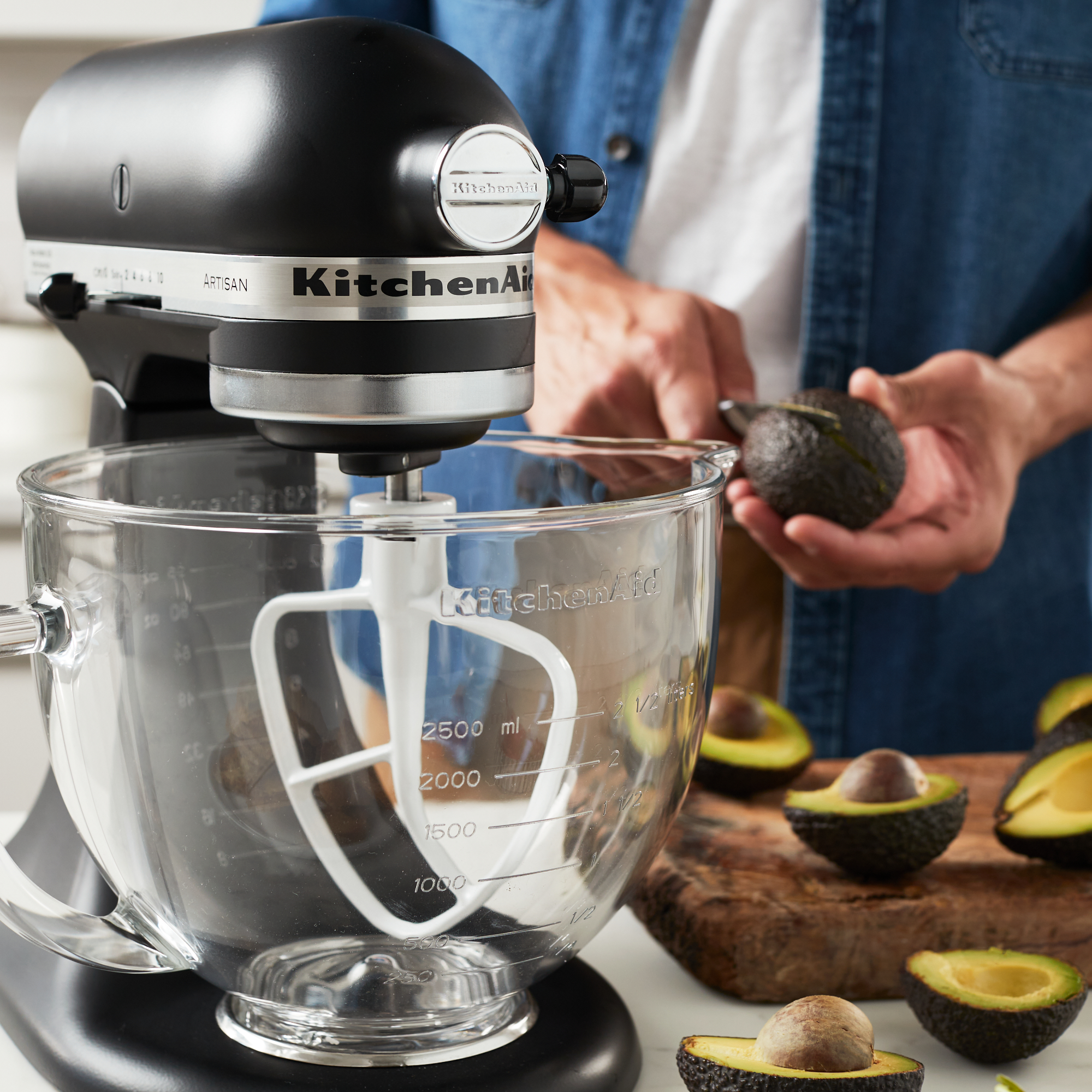 Model 5KSM156EBM to wyjątkowa wersja wyposażenia miksera Artisan 5, adresowana do tych, którzy szukają połączenia wyjątkowego koloru z niestandardową dzieżą. Proponowane zestawienie eleganckiego koloru czarny mat ze szklaną dzieżą, będzie ozdobą każdej kuchni.