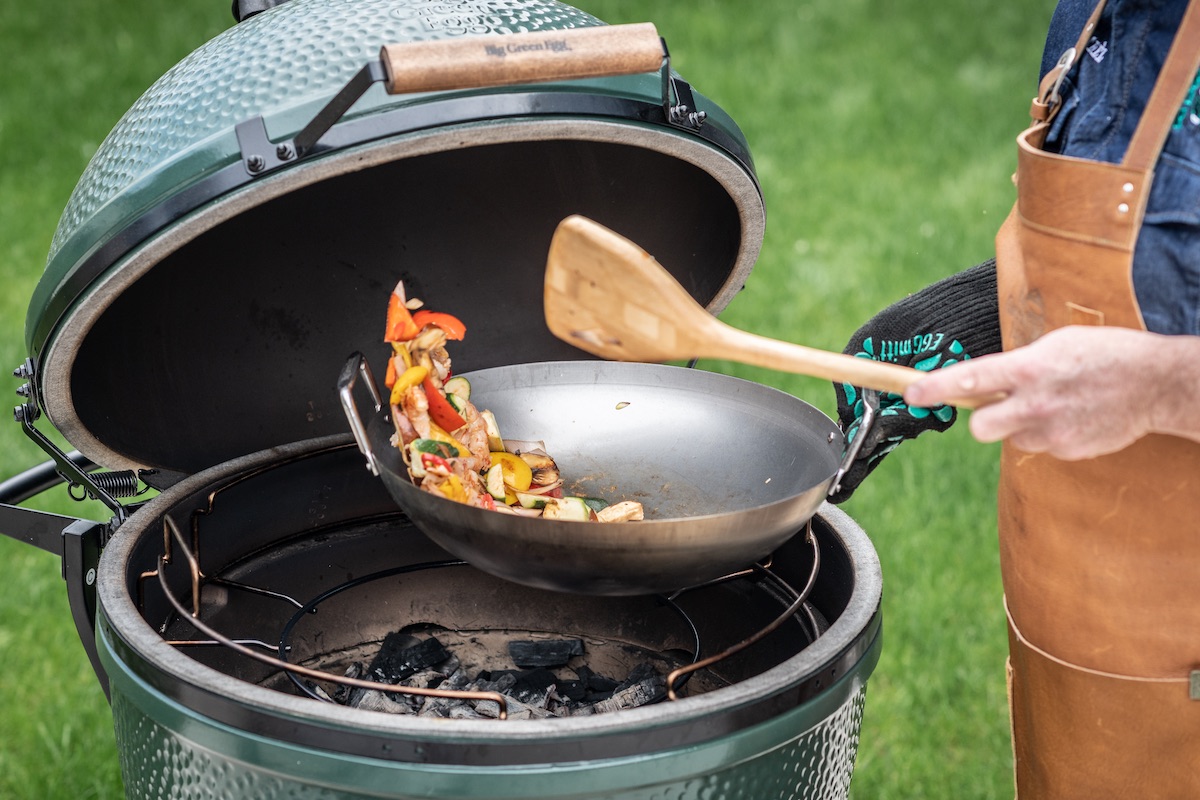 Jednoelementowy koszyk convEGGtor Basket to rewolucyjne akcesorium, które ułatwia umieszczanie i wyjmowanie convEGGtora, woka lub rusztów z Big Green Egg. Można w nim umieścić kamień convEGGtor do gotowania pośredniego, połówkowe ruszty do gotowania bezpośredniego na różnych poziomach, lub wok do smażenia na sposób azjatycki. Koszyk znacznie ułatwia manipulowanie gorącymi akcesoriami.