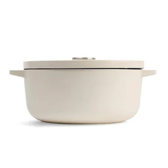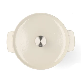 Kremowy emaliowany garnek żeliwny o pojemności 5,2L to połącznie elegancji, wyrafinowanego stylu i wysoko cenionych właściwości termicznych żeliwa. Idealnie sprawdzi się przy smażeniu, duszeniu i długotrwałym gotowaniu na małym ogniu oraz pieczeniu. Dzięki odporności na temperaturę do 260ºC może być także używany w piekarniku. Kolor garnka idealnie pasuje do miksera planetarnego KitchenAid w kolorze Almond Cream. W komplecie także solidna żeliwna pokrywka z wygodnym uchwytem ze stali nierdzewnej. Nie nadaje się do mycia w zmywarce.