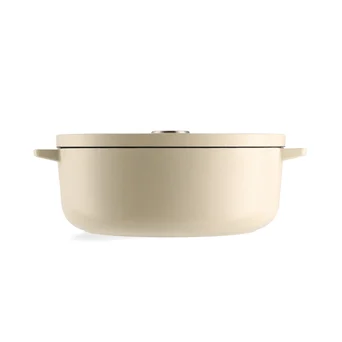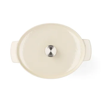 Kremowy, owalny, emaliowany garnek żeliwny o pojemności 5,6L to połącznie elegancji, wyrafinowanego stylu i wysoko cenionych właściwości termicznych żeliwa. Idealnie sprawdzi się przy smażeniu, duszeniu i długotrwałym gotowaniu na małym ogniu oraz pieczeniu. Dzięki odporności na temperaturę do 260ºC może być także używany w piekarniku. Kolor garnka idealnie pasuje do miksera planetarnego KitchenAid w kolorze Almond Cream. W komplecie także solidna żeliwna pokrywka z wygodnym uchwytem ze stali nierdzewnej. Nie nadaje się do mycia w zmywarce.