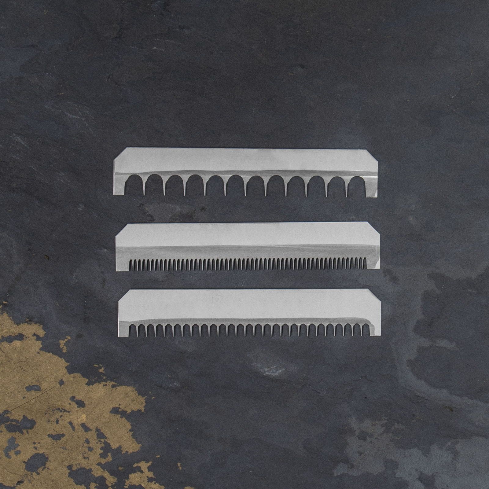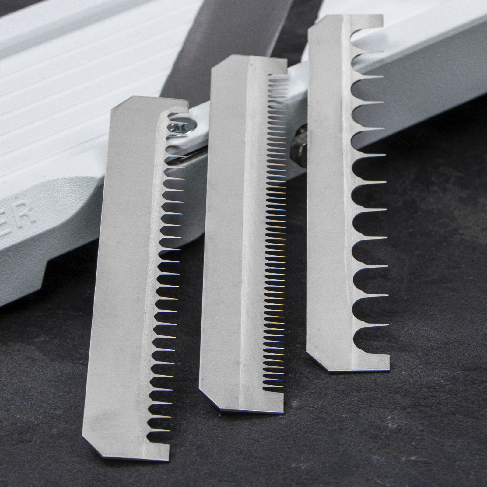 - Urządzenie dysponuje polem roboczym o szerokości 6,4 cm i zostało wyposażone w cztery ostrza ze stali hartowanej: jedno gładkie z prostą krawędzią oraz trzy falistych o zróżnicowanym rozmieszczeniu ząbków.