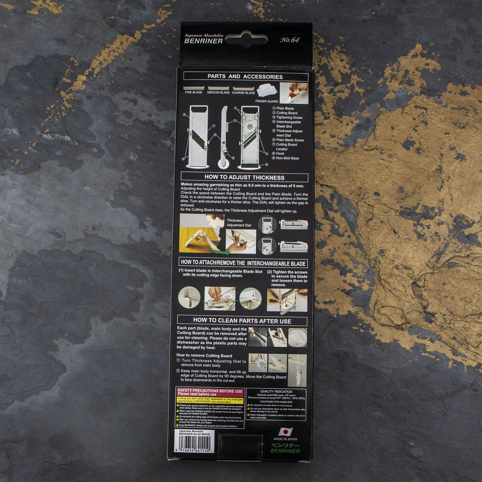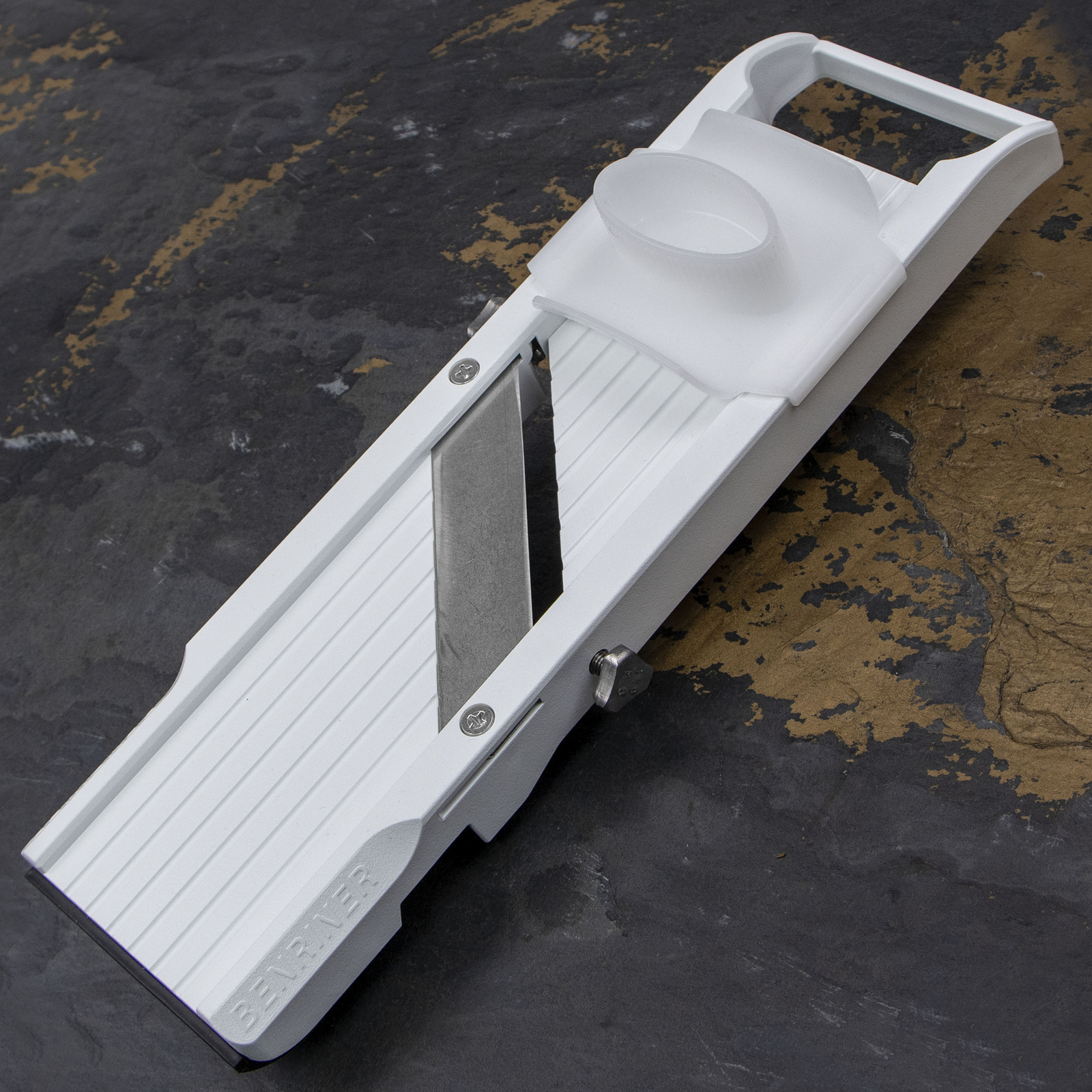 Mandolina wyposażona jest w praktyczny haczyk oraz stabilną, antypoślizgową podstawę. Pozwala na dokładne krojenie warzyw na plastry o grubości od 0,5 mm do 5 mm. Dzięki zintegrowanemu haczykowi tarkę można wygodnie zainstalować na brzegu miski, co usprawnia proces zbierania pokrojonych składników.