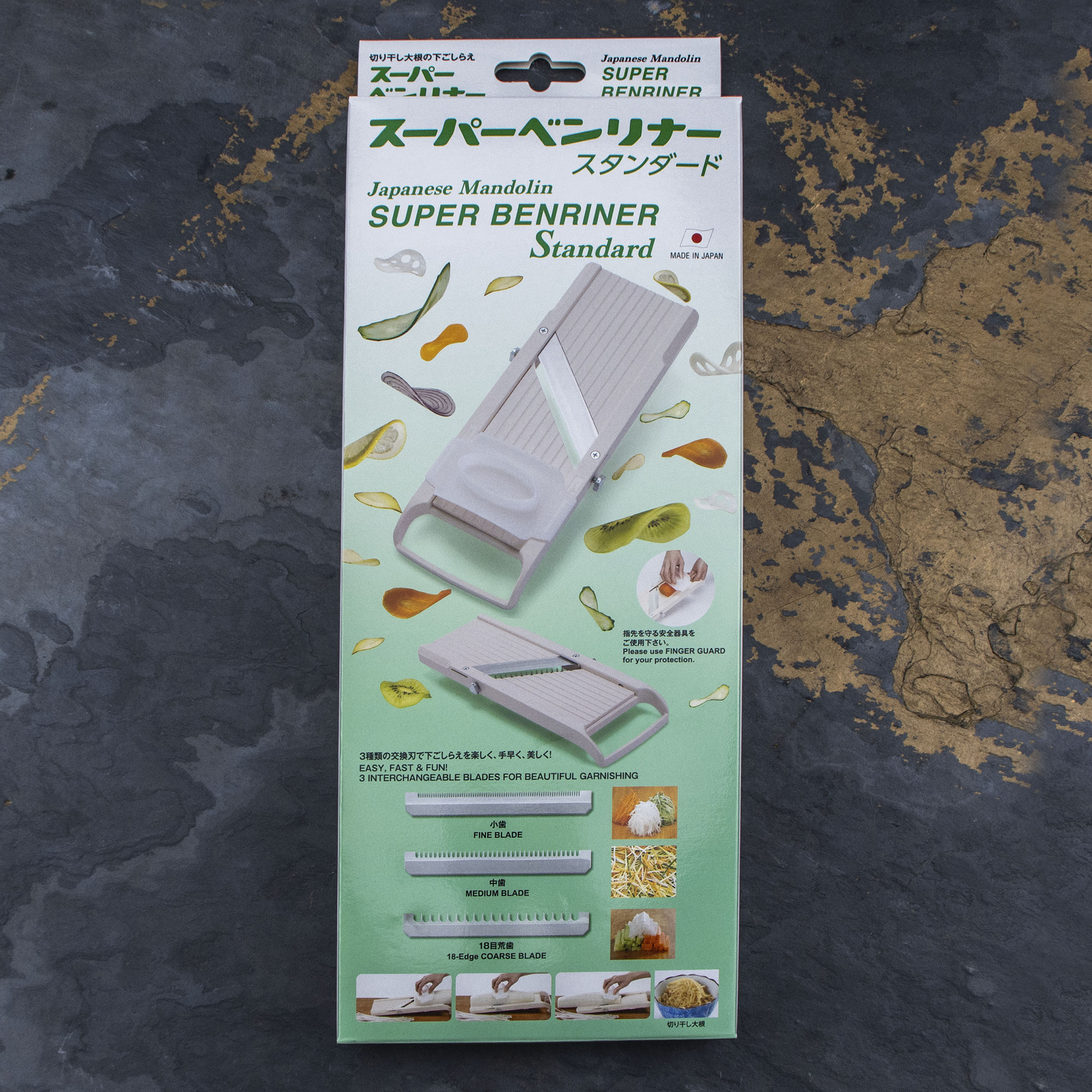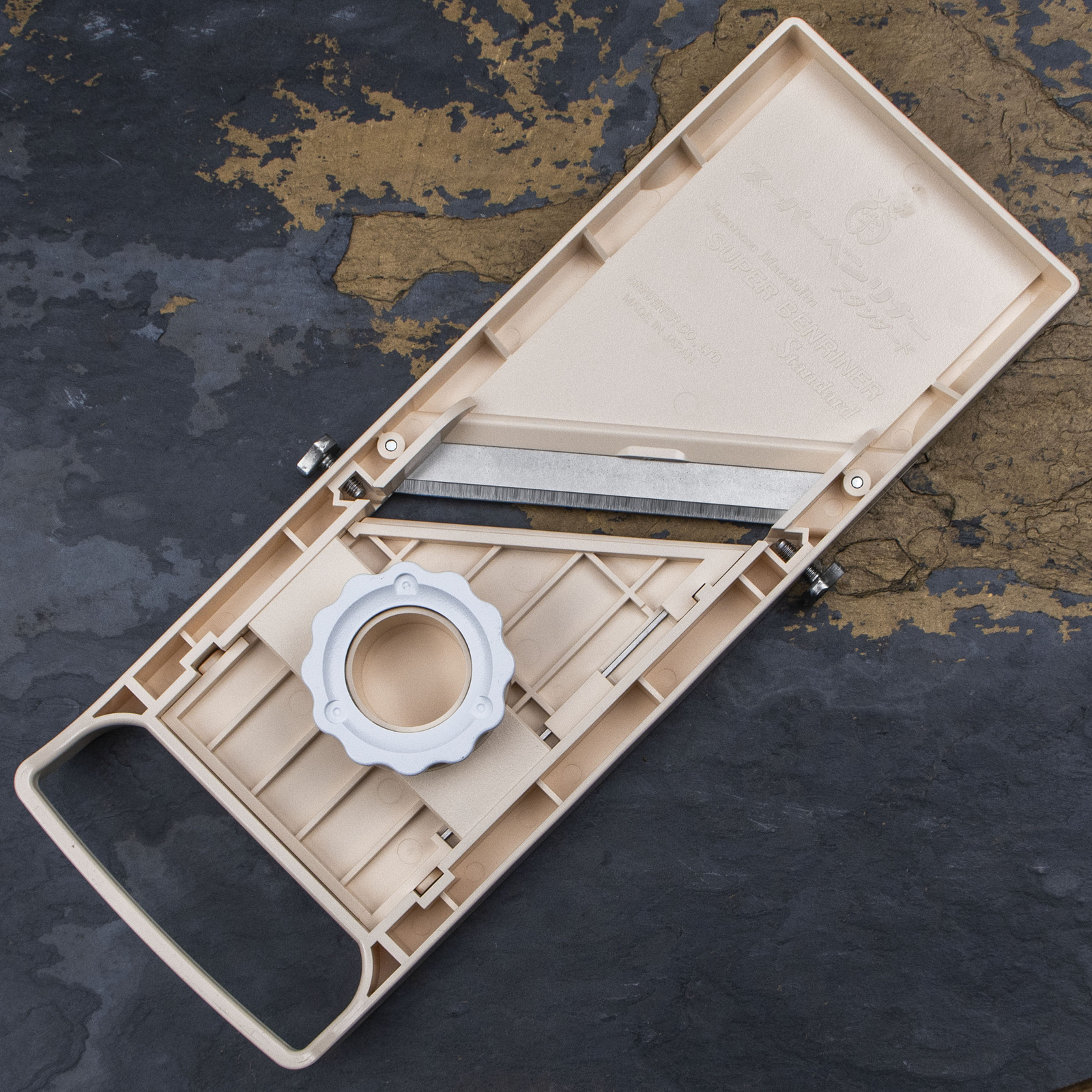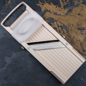 Mandolina wyposażona jest w komplet ostrzy obejmujący trzy wymienne elementy tnące z rozstawem ząbków 1 mm, 3 mm, 7 mm oraz jedno z gładką krawędzią. Została wyprodukowana z atestowanego tworzywa sztucznego, dopuszczonego do kontaktu ze środkami spożywczymi. Produkt powstaje w oparciu o ponad 80-letnie doświadczenie produkcyjne, co gwarantuje niezawodność i jakość wykonania.