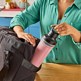 Po zblendowaniu składników można zamknąć go szczelną pokrywką z ustnikiem i zabrać swój ulubiony napój lub koktajl "na wynos".