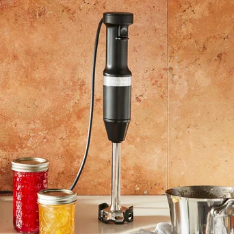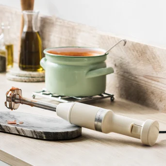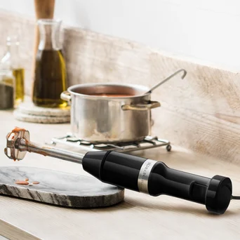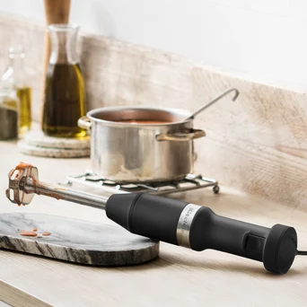 Nowy przewodowy, bogato wyposażony blender ręczny o lekkiej konstrukcji skutecznie miksuje produkty do kremowej postaci. Doskonale sprawdzi się do koktajlu, zup, sosów i majonezów. Przy pomocy rozdrabniacza można także przygotować pasty kanapkowe, pokruszyć orzechy, poszatkować zioła lub ząbki czosnku. Rózga służy do ubijania i napowietrzania małych ilości produktów np. jednego jajka. Wyposażenie dobrano tak by objęło szeroki przekrój czynności możliwych do wykonania przy jednoczesnym zaoszczędzeniu cennego miejsca w kuchni.