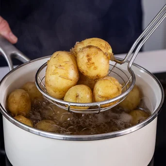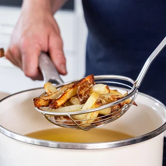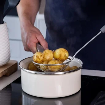 Łyżka cedzakowa ze stali nierdzewnej to nieodzowny pomocnik podczas gotowania, blanszowania, smażenia w głębokim tłuszczu oraz przygotowywania dań z woka. Długi uchwyt zapewnia bezpieczną odległość dłoni od gorących płynów,a pewny chwyt zapewnia wygodna rączka. Można myć w zmywarce.