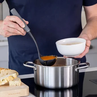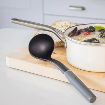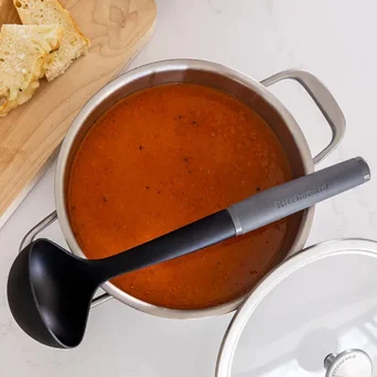 Łyżka wazowa wykonana z tworzywa odpornego na temperaturę do 232°C. Idealna do mieszania i nalewania wszelkich zup i sosów. Bezpieczna dla naczyń z powłokami nieprzywierającymi. Wyposażona w wygodny uchwyt. Można myć w zmywarce. Nie pozostawiać w gorących naczyniach.