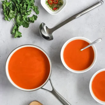 Głęboka chochla z eleganckiej szczotkowanej stali nierdzewnej. Idealna do mieszania i podawania sosów i zup. Solidna, trwała, wyposażona w przydatne uszko do zawieszania. Można myć w zmywarce.