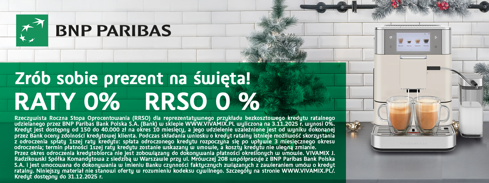Propozycja łączy się z innymi promocjami i obowiązuje także przy zakupie z użyciem Karty Stałego Klienta lub Karty Dużej Rodziny. Rzeczywista Roczna Stopa Oprocentowania (RRSO) dla reprezentatywnego przykładu bezkosztowego kredytu udzielanego przez BNP Paribas Bank Polska S.A. (Bank) w sklepie sklep.vivamix.pl wyliczona na 3.11.2025 r. wynosi 0%. Kredyt jest dostępny od 100 do 40 000 zł na okres 10 miesięcy, a spłata pierwszej raty następuję po okresie karencji wynoszącym od 1 do 3 miesięce. Decyzja o udzieleniu kredytu uzależniona jest od dokonanej przez Bank oceny zdolności kredytowej Klienta. Niniejszy materiał nie stanowi oferty.