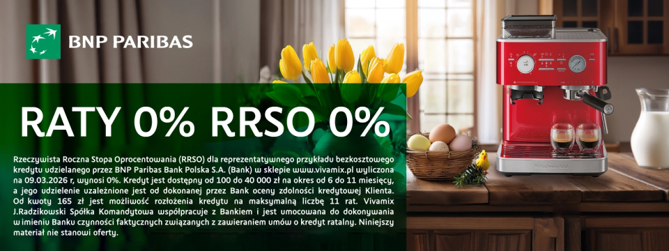 Propozycja łączy się z innymi promocjami i obowiązuje także przy zakupie z użyciem Karty Stałego Klienta lub Karty Dużej Rodziny. Rzeczywista Roczna Stopa Oprocentowania (RRSO) dla reprezentatywnego przykładu bezkosztowego kredytu udzielanego przez BNP Paribas Bank Polska S.A. (Bank) w sklepie www.vivamix.pl wyliczona na 09.03.2026 r. wynosi 0%. Kredyt jest dostępny od 100 do 40 000 zł na okres od 6 do 11 miesięcy, a jego udzielenie uzależnione jest od dokonanej przez Bank oceny zdolności kredytowej Klienta. Od kwoty 165 zł jest możliwość rozłożenia kredytu na maksymalną liczbę 11 rat. Vivamix J. Radzikowski Spółka Koamndytowa współpracuje z Bankiem i jest umocowana do dokonywania w imieniu Banku czynności faktycznych związanych z zawieraniem umów o kredyt ratalny. Niniejszy materiał nie stanowi oferty.