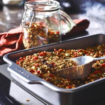 Forma do pieczenia marki KitchenAid, wykonana jest z grubej stali aluminiowanej o grubości 0,8 mm. Szybko i równomiernie się nagrzewa, zapewniając doskonałe rezultaty pieczenia. Forma posiada trwałą, nieprzywierającą powłokę, która ułatwia zsuwanie wypieków i gwarantuje łatwość w utrzymaniu czystości. Jest wytrzymała, zachowuje swój kształt przez lata użytkowania. Forma ma wbudowane uchwyty, które umożliwiają wygodne oraz bezpieczne przenoszenie gorącej formy. Stworzona do wypieku ciast, ale doskonale sprawdza się także w przypadku zapiekanek makaronowych, mięsa oraz ryb. Odporna na temperatury do 230°C. Można myć w zmywarce. W celu wydłużenia trwałości powłoki nieprzywierających zaleca się mycie ręczne.