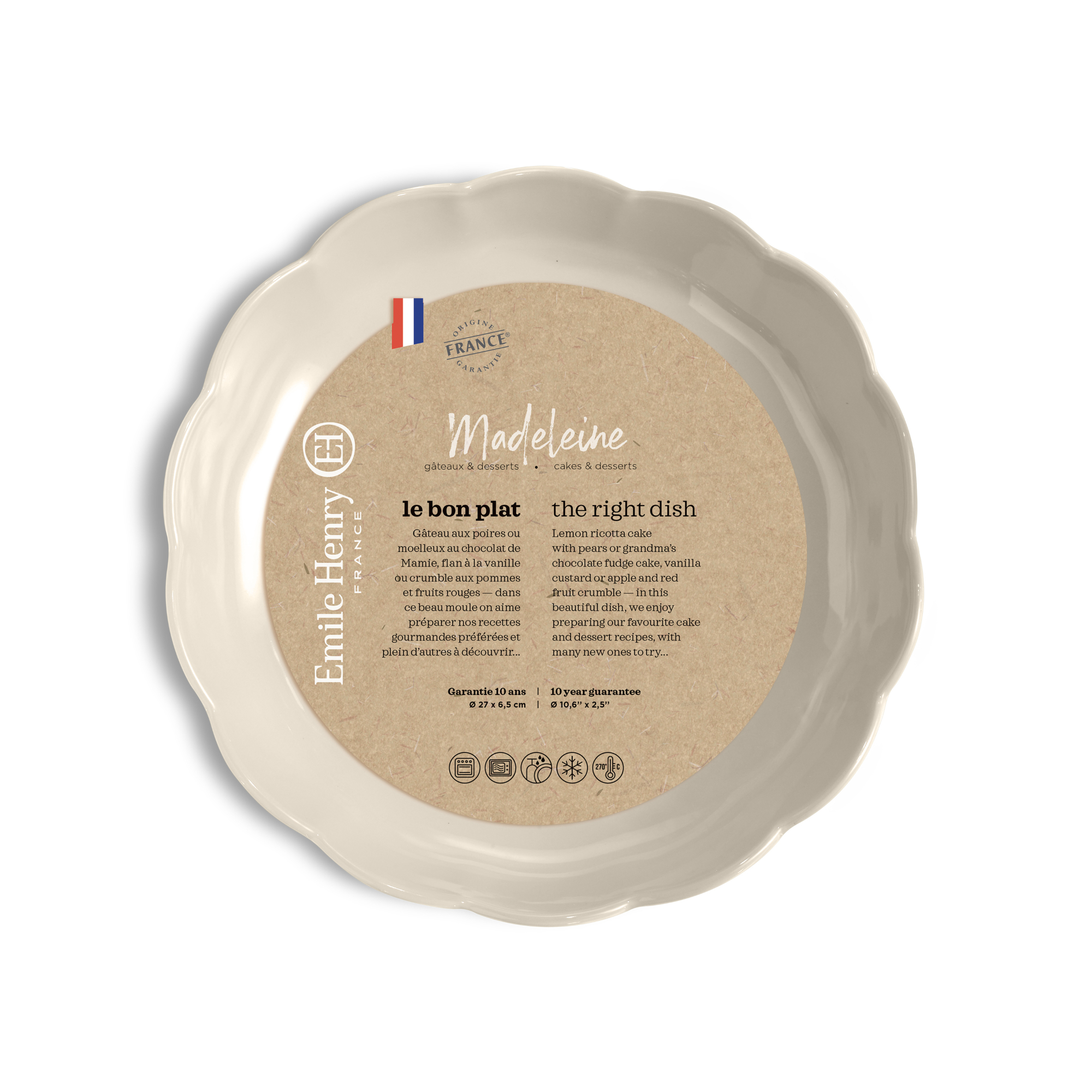 - Równomierne rozprowadzanie ciepła - Ceramika Emile Henry od zawsze była idealnym materiałem do pieczenia ciast i deserów. Okrągła forma Madeleine równomiernie rozprowadza ciepło, docierając do samego środka wypieku.