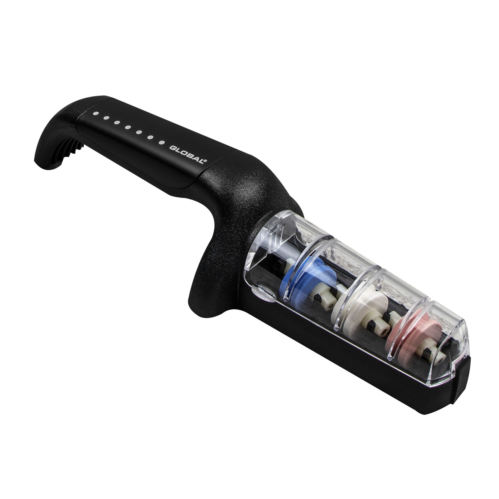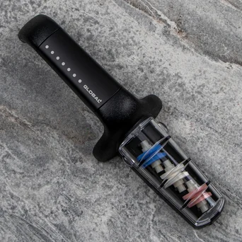 Ceramiczna ostrzałka wodna G-913/BW oferuje trzystopniowy system ostrzenia w jednym narzędziu. Niebieskie koło o grubym ziarnie służy do ostrzenia wstępnego – odświeża przytępione ostrza. Usuwa drobne uszkodzenia i przywraca właściwy kształt krawędzi tnącej. Białe koło o średnim ziarnie dopracowuje efekt ostrzenia, a koło różowe o drobnym ziarnie nadaje nożom gładkość i precyzję cięcia.