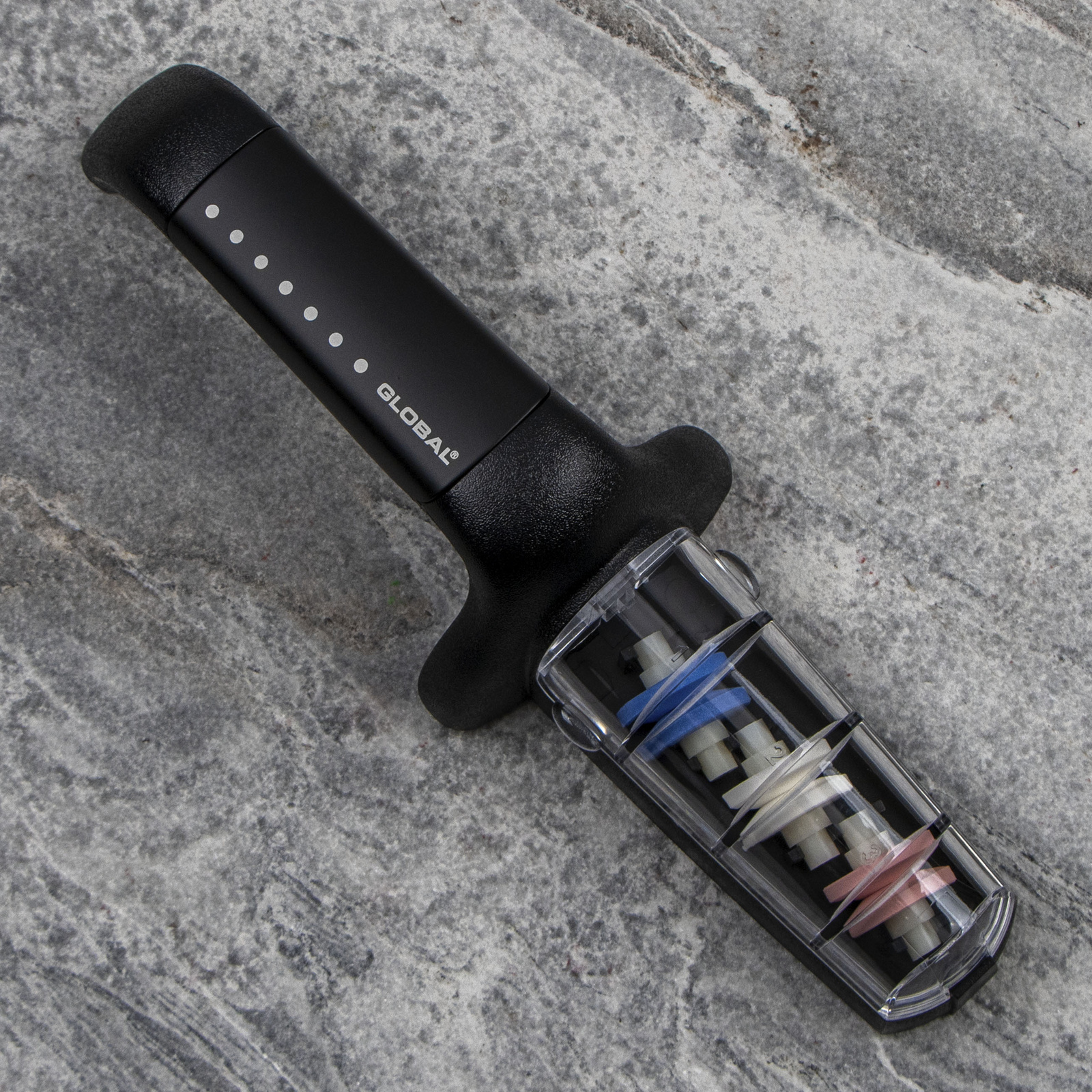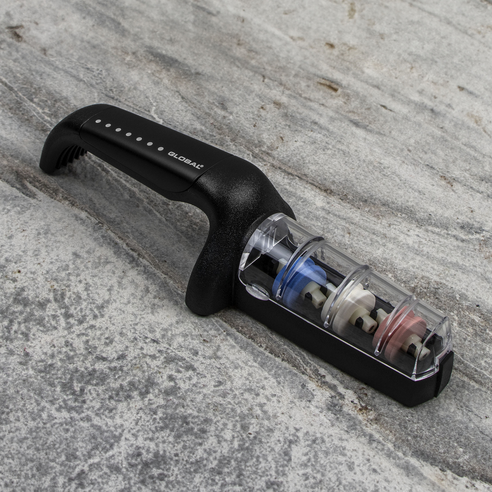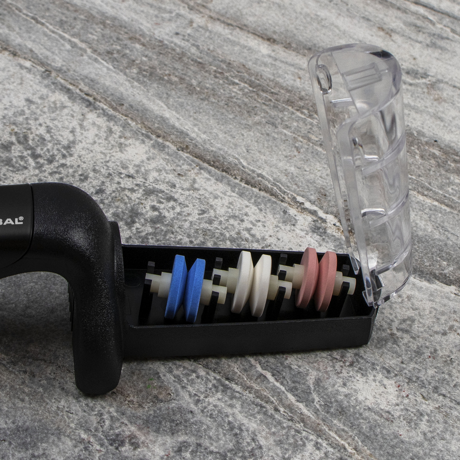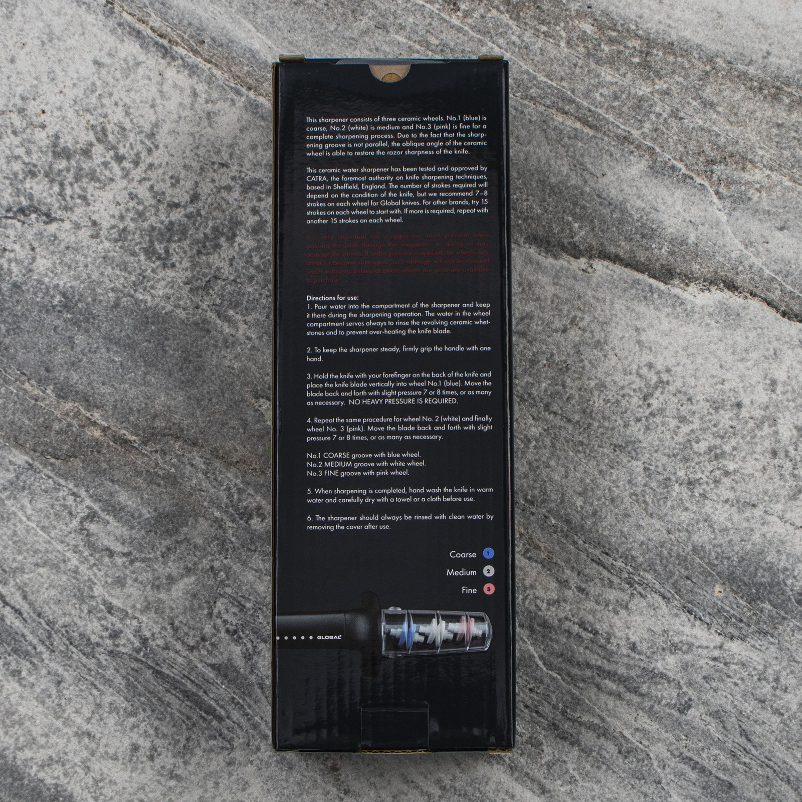 Zastosowanie ceramicznych elementów gwarantuje trwałość oraz zachowanie właściwości ostrzące przez lata użytkowania. Natomiast użycie wody podczas ostrzenia zapobiega przegrzaniu stali, chłodzi ostrze oraz oczyszcza powierzchnię kół. Gumowany uchwyt i podstawa mają właściwości antypoślizgowe.
