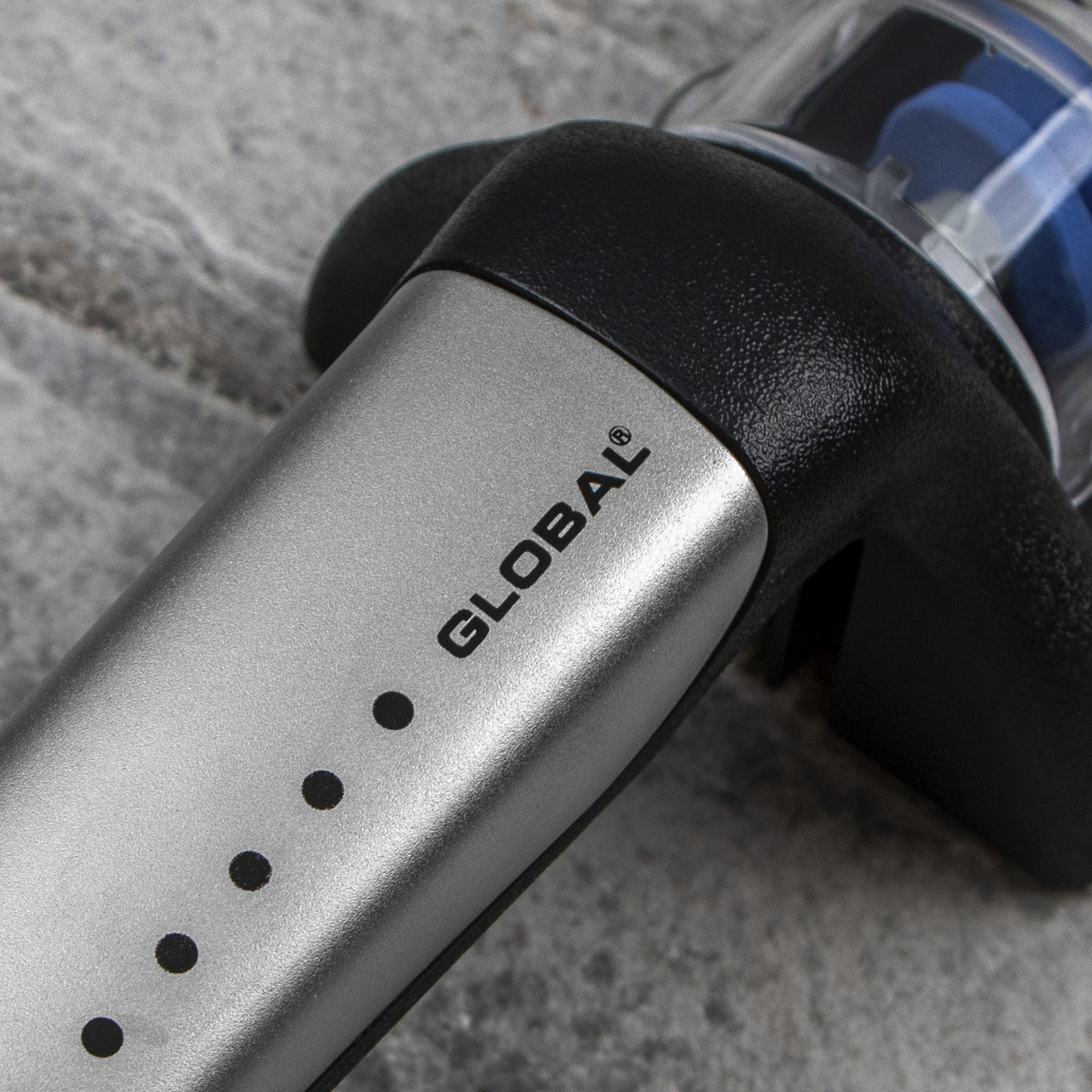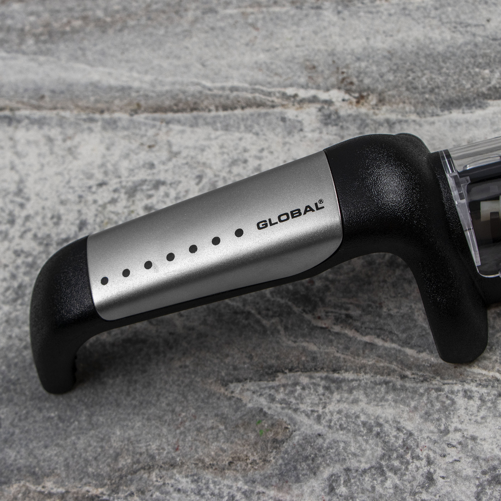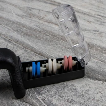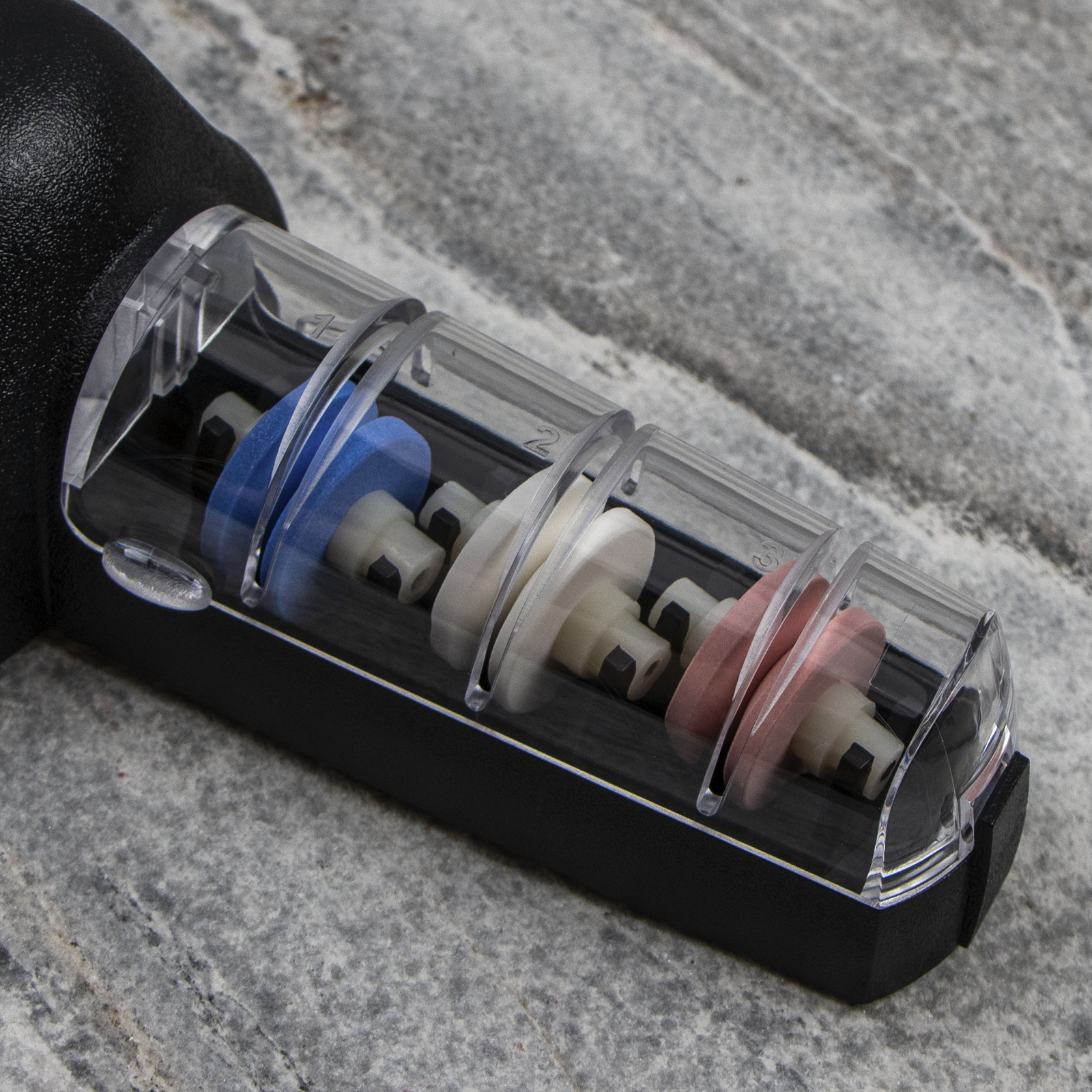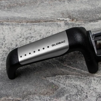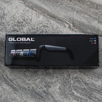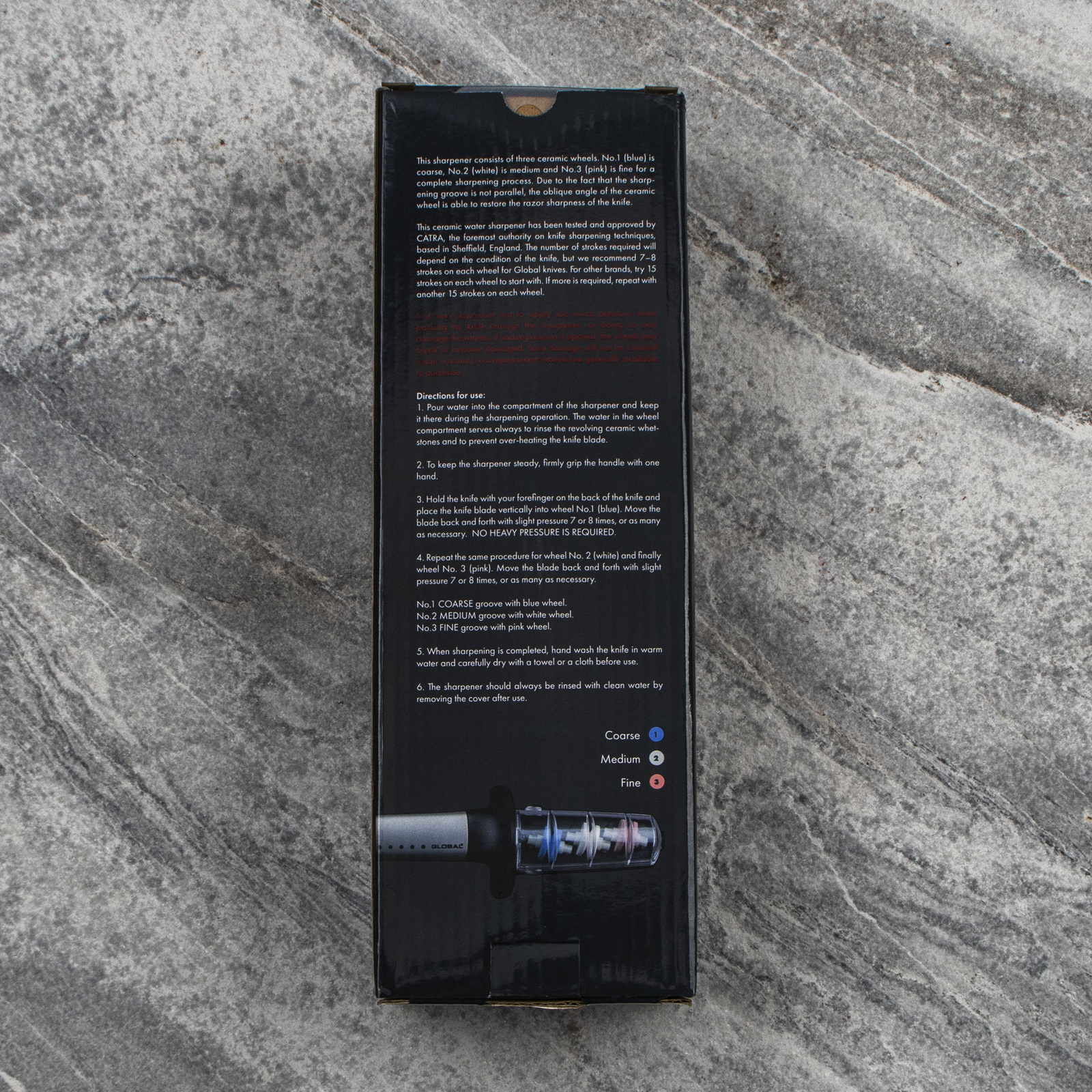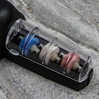 Zastosowanie ceramicznych elementów gwarantuje trwałość oraz zachowanie właściwości ostrzące przez lata użytkowania. Natomiast użycie wody podczas ostrzenia zapobiega przegrzaniu stali, chłodzi ostrze oraz oczyszcza powierzchnię kół. Gumowany uchwyt i podstawa mają właściwości antypoślizgowe.