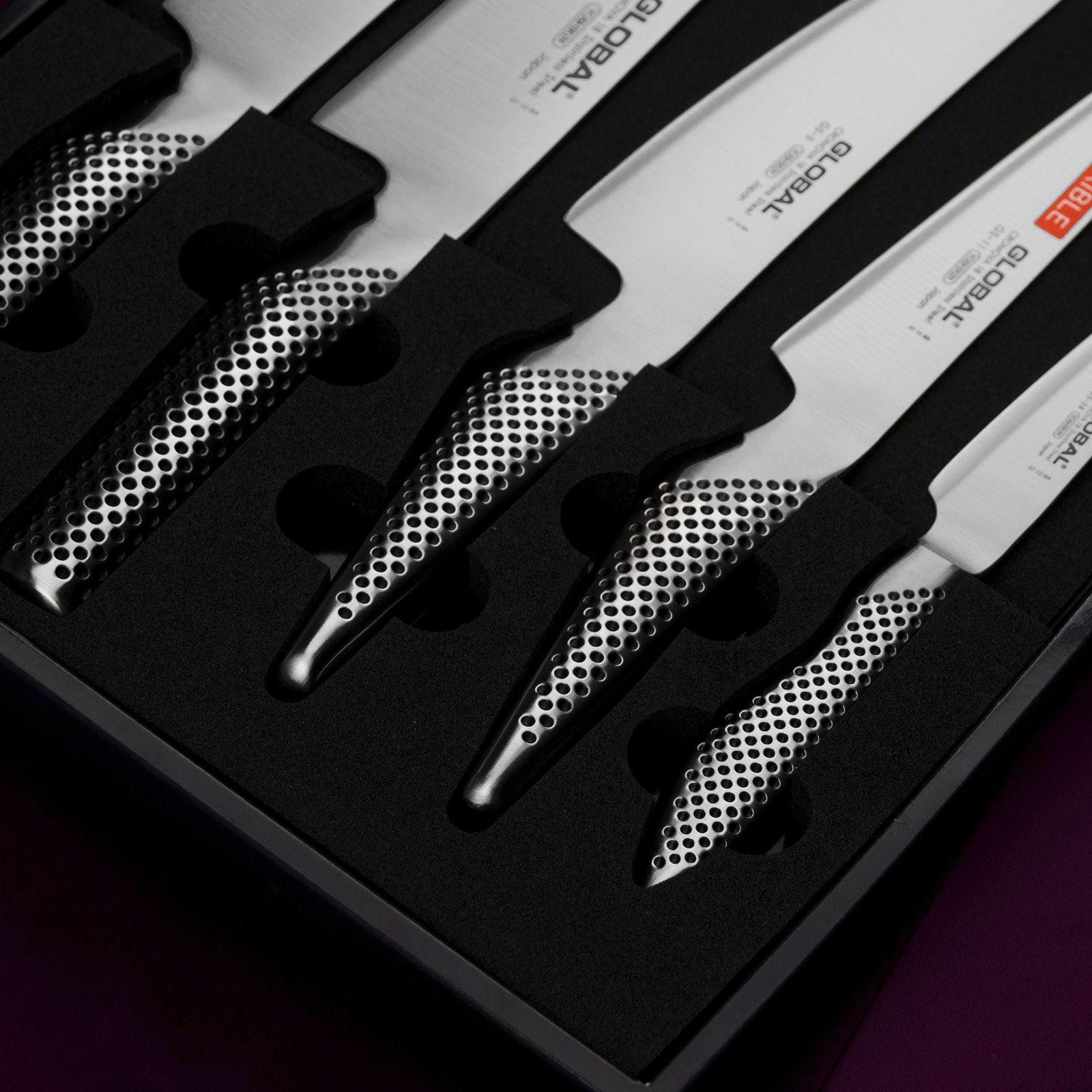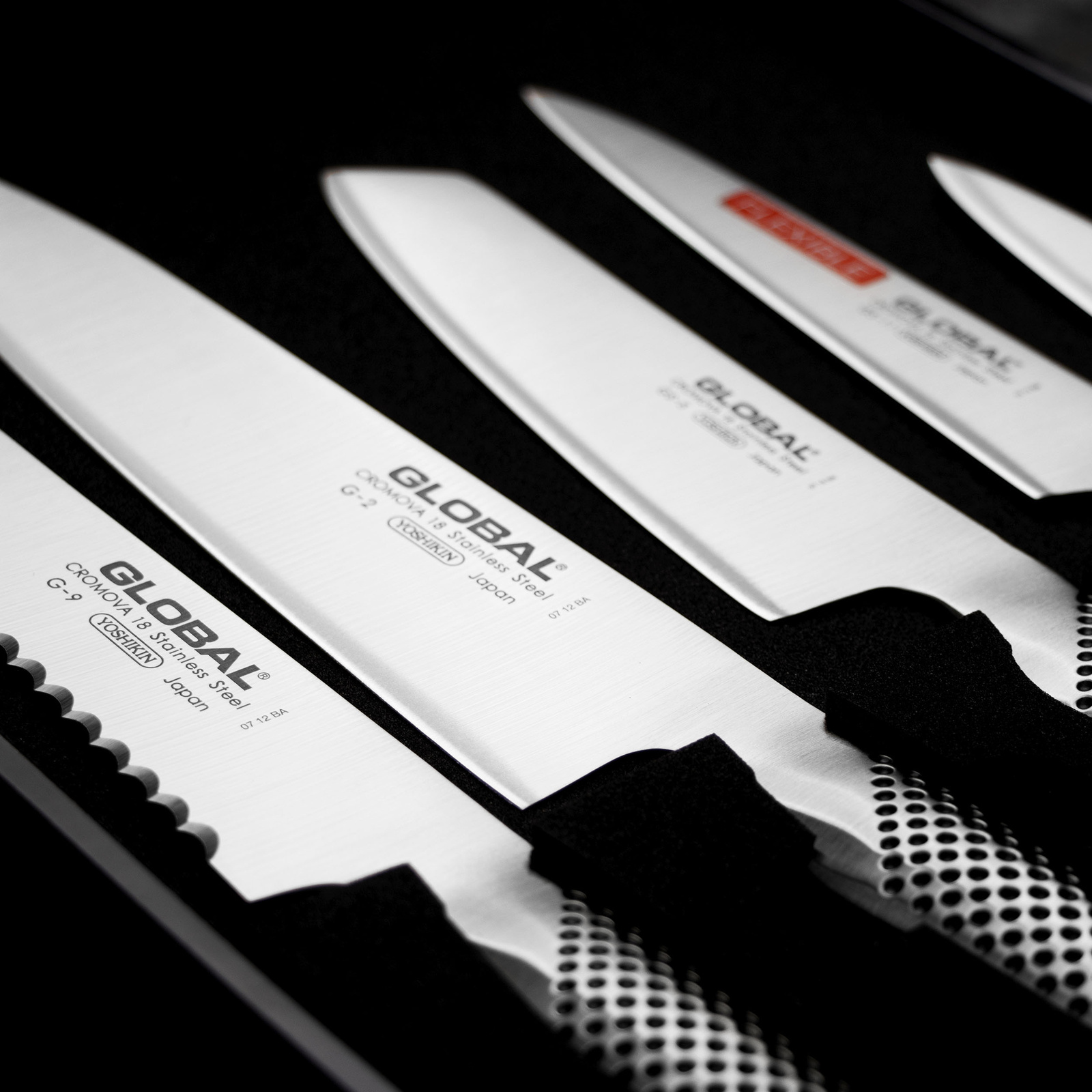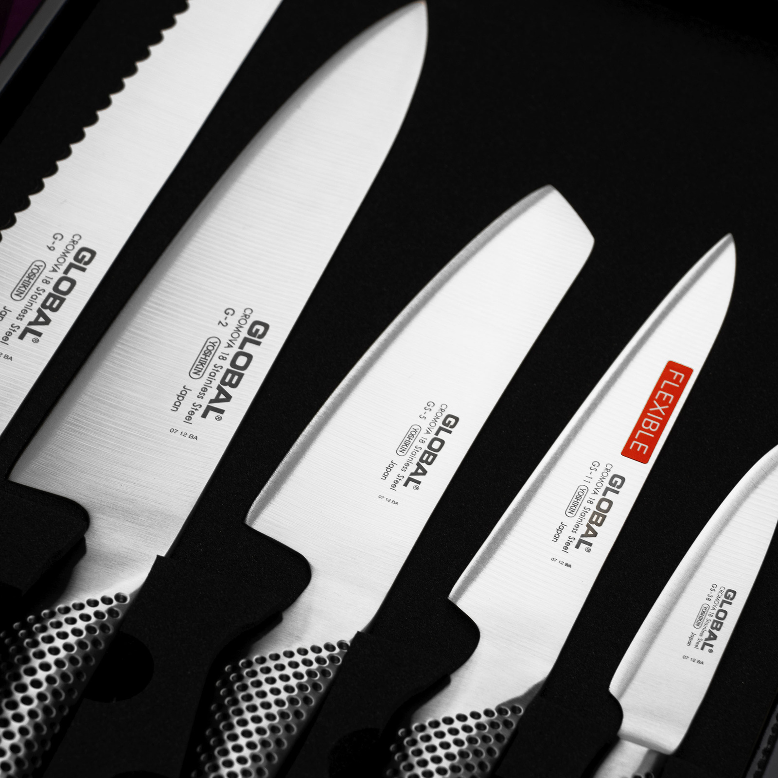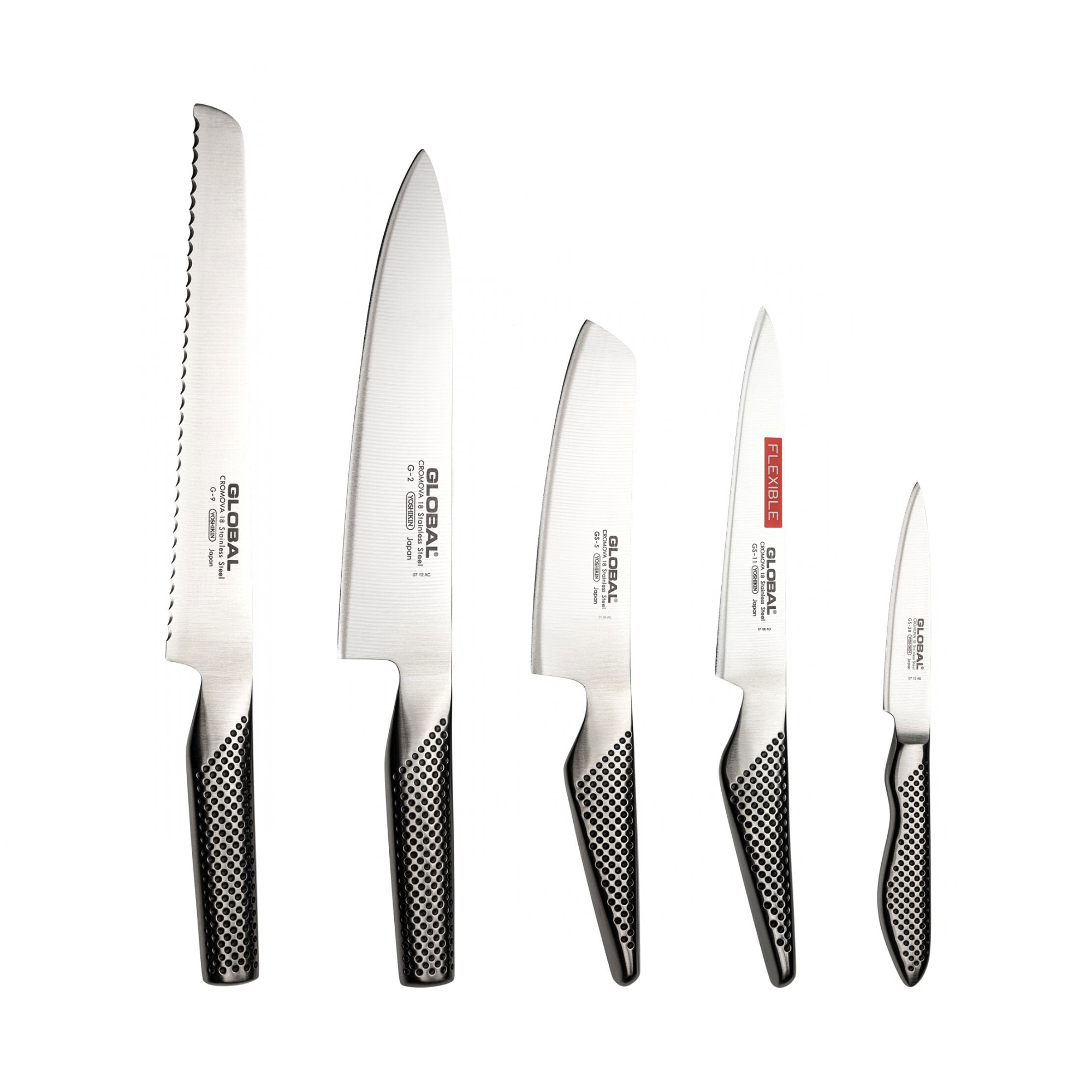 Zestaw 5 Noży kuchennych Global to doskonała baza do budowania własnej kolekcji narzędzi kuchennych. Zawiera wszystkie niezbędne modele, które sprawdzą się w codziennym gotowaniu.