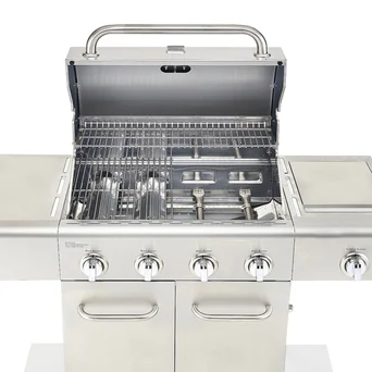 Grill gazowy DeLuxe uznanej amerykańskiej marki Kenmore to duże i solidne urządzenie o całkowitej mocy palników 15,5 kW. Przypadnie do gustu miłośnikom grillowania z większym apetytem, którzy od swojego grilla oczekują najwyższej jakości. Cztery główne palniki mają moc 3 kW każdy i gwarantują równomierną dystrybucję ciepła w każdym punkcie solidnego, dwuczęściowego rusztu. Dodatkowo model DeLuxe wyposażono w boczny, prostokątny palnik ceramiczny na podczerwień o mocy 3,5 kW, idealny do opiekania steków lub szybkiego zagotowania wody.