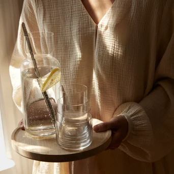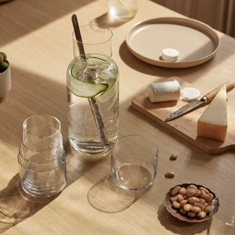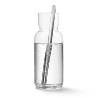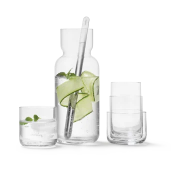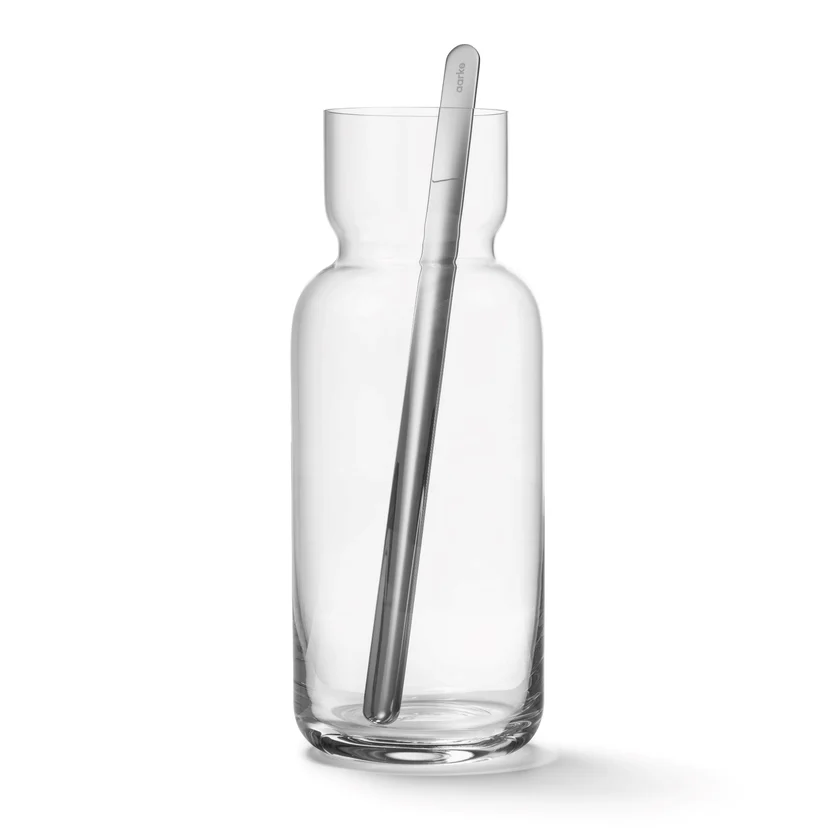 Cienka karafka ze szkła kryształowego została połączona z elegancką łyżką do mieszania koktajli ze stali nierdzewnej. Idealna do codziennych zimnych napojów. Do karafki można dobrać zestaw 4 szklanek Aarke. Szklanki mają tę samą sylwetkę co górna część karafki, a najszersza szklanka idealnie pasuje jako praktyczna pokrywka karafki.