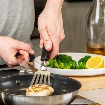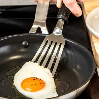 Łopatka ze stali nierdzewnej, idealna do smażenia delikatnych potraw, np. ryb lub omletów. Dzięki elastycznej, ściętej krawędzi z łatwością wsuwa się pod potrawy. Wyposażona w ergonomiczny uchwyt. Można myć w zmywarce. Podczas smażenia nie pozostawiać w patelni.