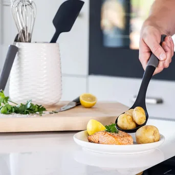 Łyżka kuchenna do mieszania wykonana z tworzywa odpornego do temp. 232°C. Nie rysuje naczyń z powłokami nieprzywierającymi. Można myć w zmywarce.