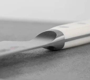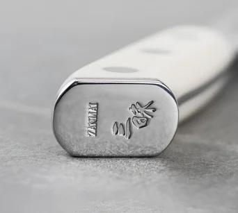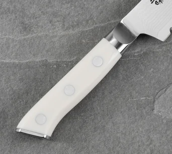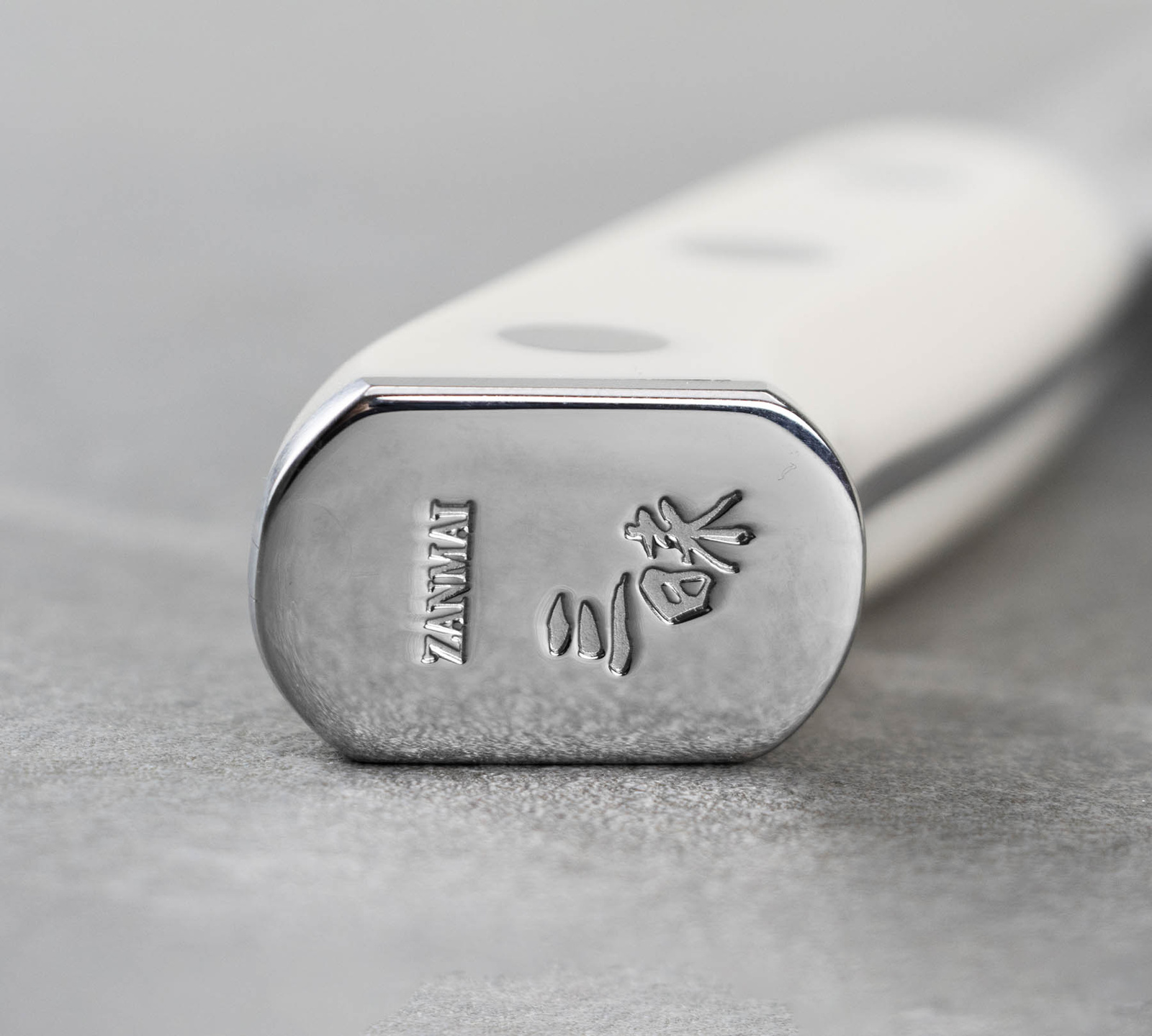 Nitowana rękojeść z corianu charakteryzuje się ergonomicznym profilem zapewniającym komfortowy chwyt podczas długotrwałej pracy. Corian jest odporny na wilgoć i wysokie temperatury. Wykazuje wysoką trwałość oraz odporność na odkształcenia. Dolna część rękojeści wykonana jest z polerowanej na wysoki połysk stali nierdzewnej z grawerunkiem Zanmai.