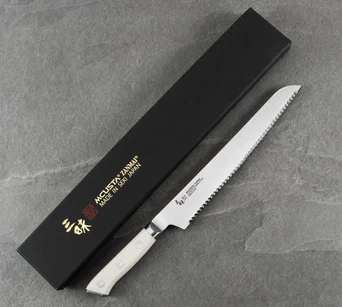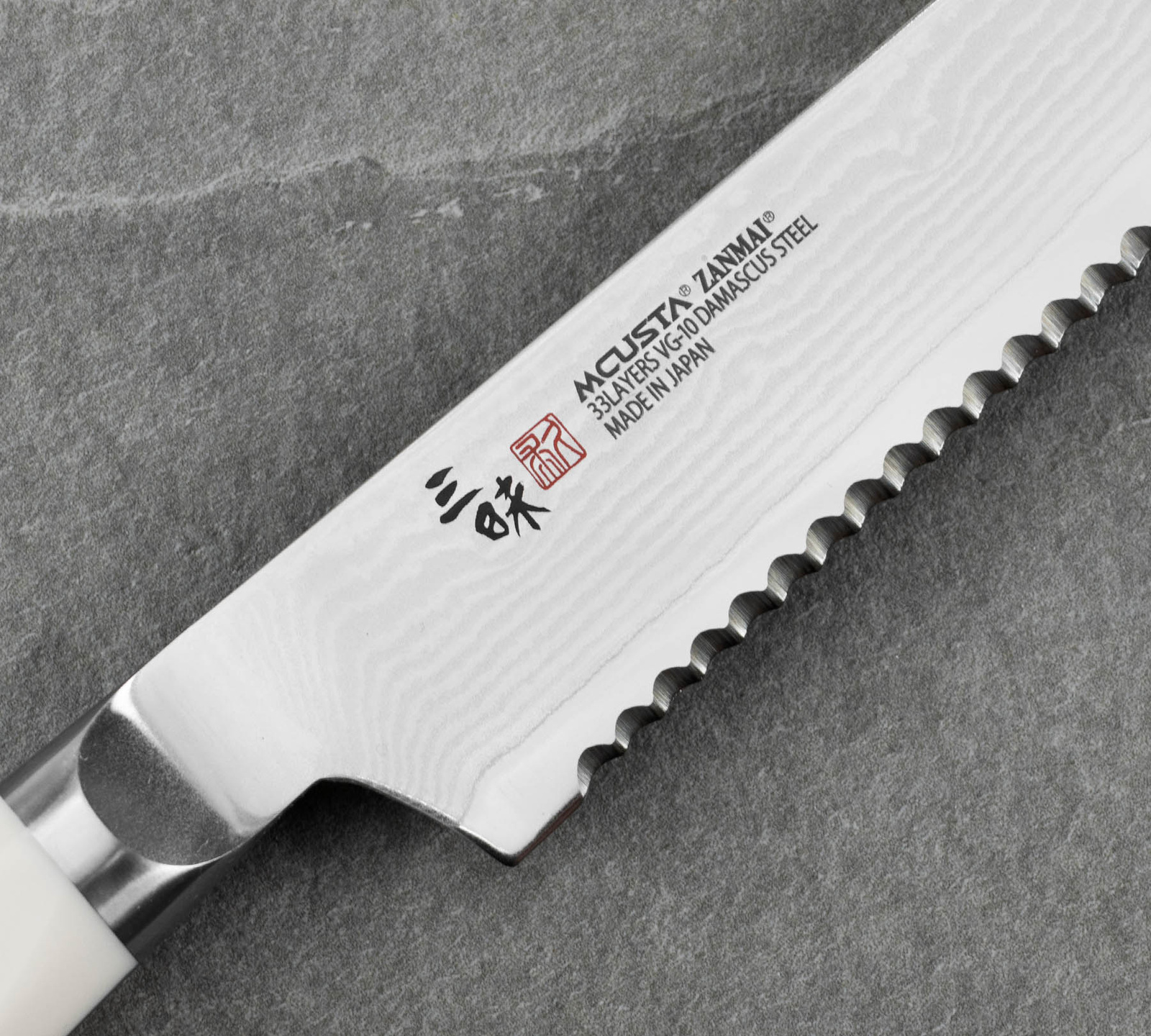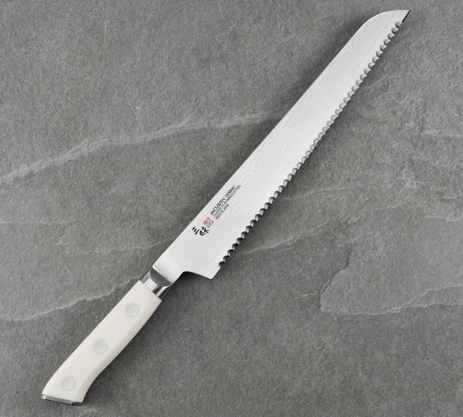Nóż do pieczywa Mcusta Zanmai Classic Damascus o długości 23 cm to specjalistyczne narzędzie zaprojektowane do precyzyjnego krojenia produktów o twardej skórce i miękkiej strukturze. Ząbkowane ostrze umożliwia czyste cięcie chleba, bułek oraz pieczywa bez zgniatania wnętrza.