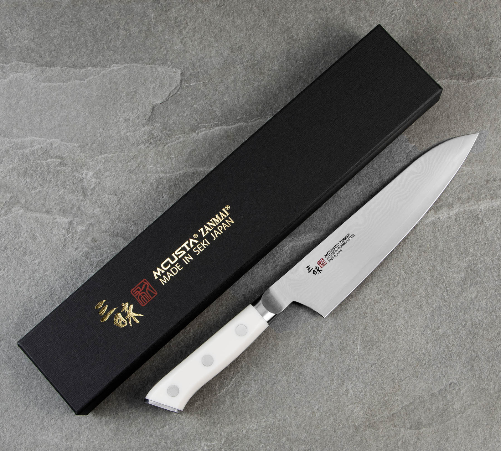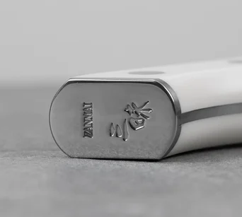 Nitowana rękojeść z corianu charakteryzuje się ergonomicznym profilem zapewniającym komfortowy chwyt podczas długotrwałej pracy. Corian jest odporny na wilgoć i wysokie temperatury. Wykazuje wysoką trwałość oraz odporność na odkształcenia. Dolna część rękojeści wykonana jest z polerowanej na wysoki połysk stali nierdzewnej z grawerunkiem Zanmai.