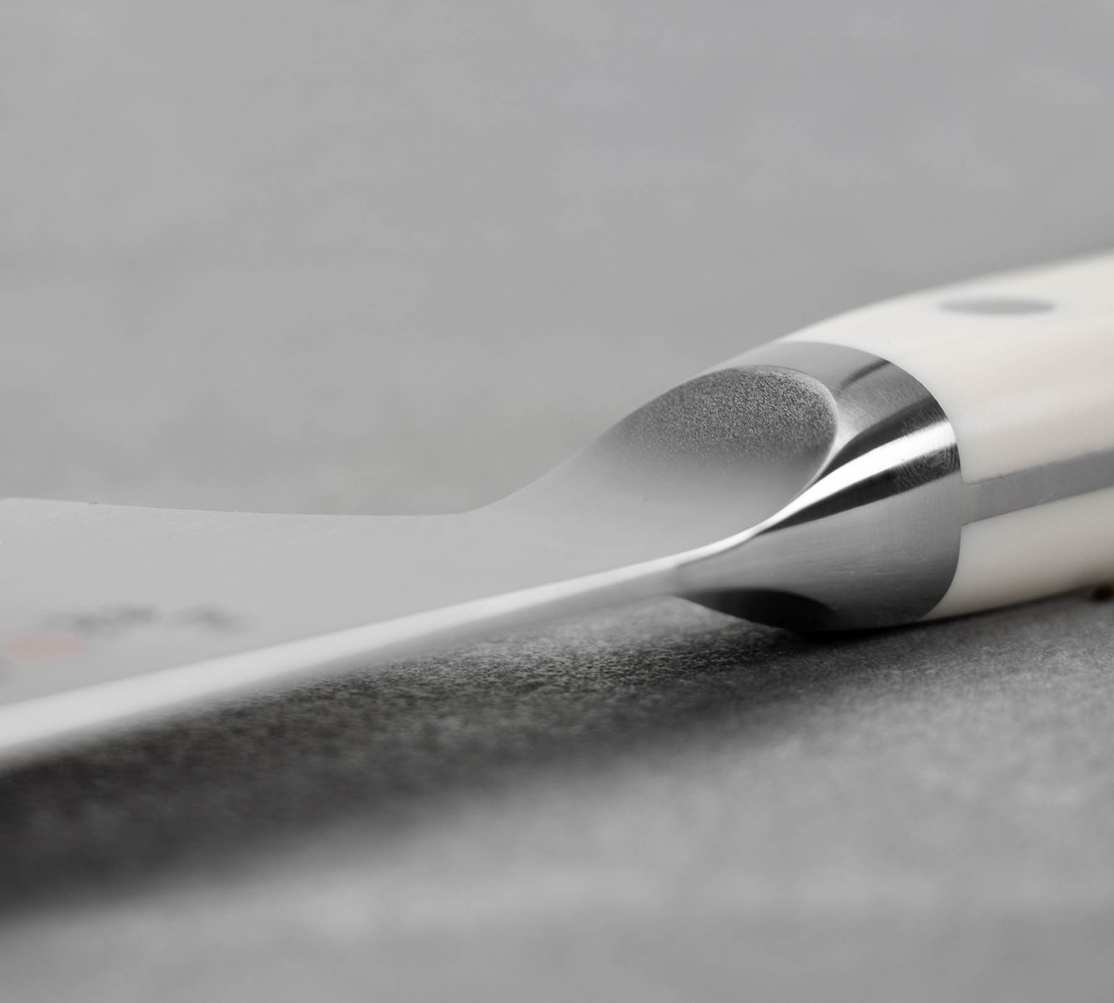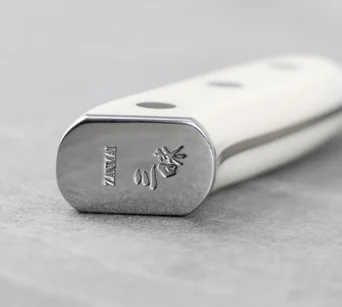 Nitowana rękojeść z corianu charakteryzuje się ergonomicznym profilem zapewniającym komfortowy chwyt podczas długotrwałej pracy. Corian jest odporny na wilgoć i wysokie temperatury. Wykazuje wysoką trwałość oraz odporność na odkształcenia. Dolna część rękojeści wykonana jest z polerowanej na wysoki połysk stali nierdzewnej z grawerunkiem Zanmai.