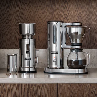 Po podłączeniu do ekspresu przelewowego Aarke młynek automatycznie oblicza wymaganą ilość ziaren na podstawie poziomu wody w zbiorniku, zapewniając idealną temperaturę kawy i wygodę.