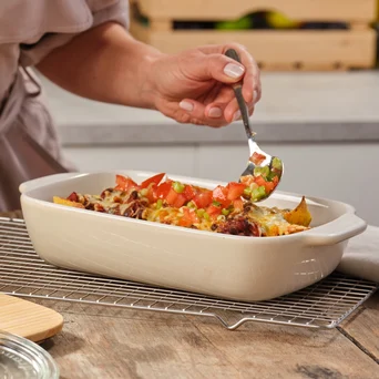 Naczynie ceramiczne średniej wielkości z kolekcji KitchenAid Stoneware doskonale sprawdzi się w zapiekaniu zarówno wytrawnych dań, jak i słodkich przysmaków. Spora pojemność 1,9L to solidna porcja pysznej zapiekanki, lasagne lub owoców pod kruszonką, które można od razu z piekarnika serwować na stół.
