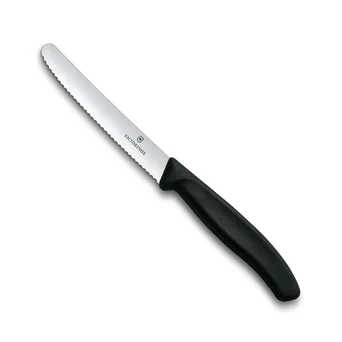 Nóż z zaokrąglonym zakończeniem i ząbkowanym ostrzem to specjalistyczne narzędzie kulinarne dedykowane do obróbki owoców i warzyw miękkich.