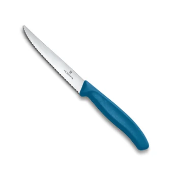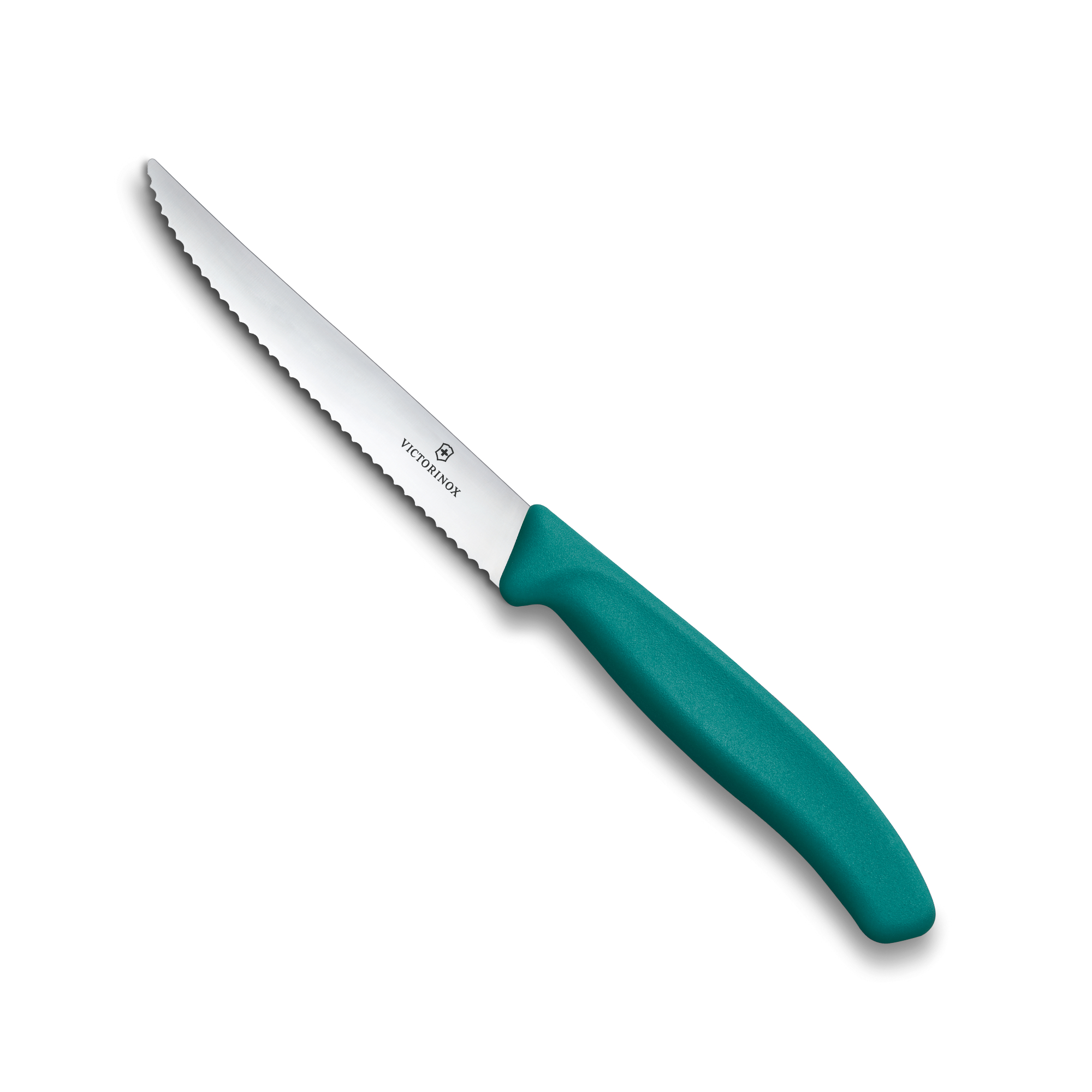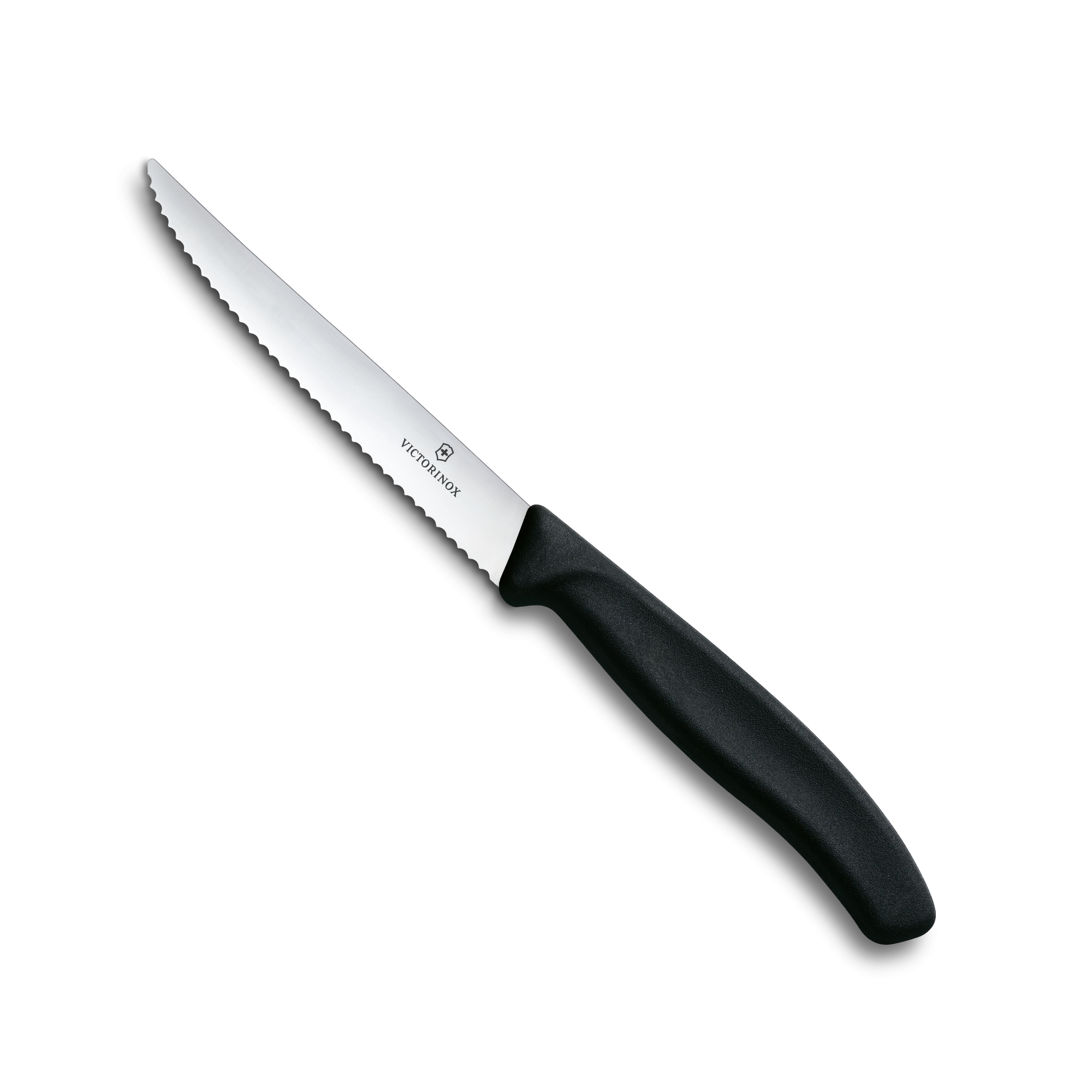 Nóż do steków Swiss Classic łączy szwajcarską precyzję z funkcjonalnością. Ząbkowana krawędź tnąca zachowuje naturalne soki i strukturę mięsa, eliminując efekt szarpania i miażdżenia tkanki. Profilowana, ergonomiczna rękojeść gwarantuje pewny chwyt. Idealny do krojenie steków i dań mięsnych.