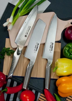 Noże kuchenne Global Seria G to m. in. noże do plastrowania, wykrawania, filetowania, noże do sashimi czy najpopularniejsze noże szefa kuchni. Znajduje się w niej również najpopularniejszy nóż kuchenny Global G-2, wielokrotnie doceniany w różnych częściach świata. Z wyjątkiem wybranych modeli, ostrza posiadają szlif obustronny zarówno dla osób prawo, jak i leworęcznych.
