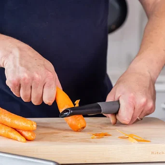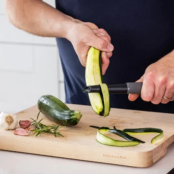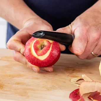 Uniwersalna obieraczka z dwustronnym, ząbkowanym ostrzem ze stali nierdzewnej, które z łatwością obiera owoce i warzywa. Zarówno te twarde, ajk i miękkie. Dobrze wyważony, ergonomiczny uchwyt zapewnia wygodną i płynną pracę. W komplecie z obieraczką znajduje się nakładka ochronna na ostrze. Można myć w zmywarce.