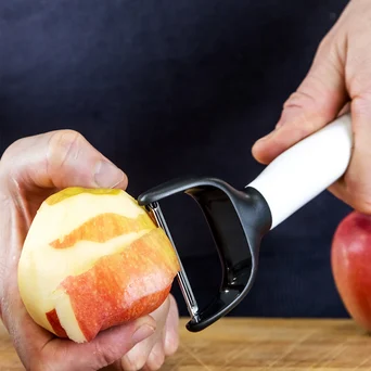 Obieraczka do warzyw z ostrzem ze stali nierdzewnej, które z łatwością obiera owoce i warzywa. Zarówno te twarde jaki miękkie. Dobrze wyważony, ergonomiczny uchwyt zapewnia wygodną i płynną pracę. W komplecie z obieraczką znajduje się nakładka ochronna na ostrze. Można myć w zmywarce.