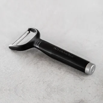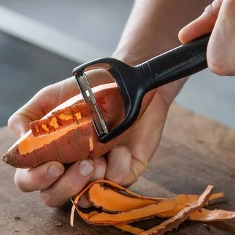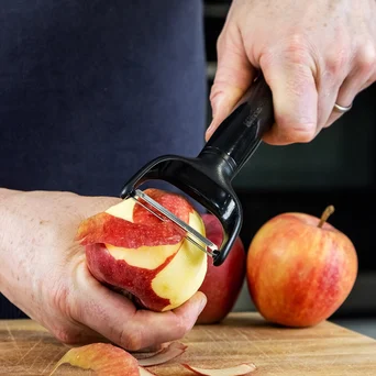 Obieraczka do warzyw z ostrzem ze stali nierdzewnej, które z łatwością obiera owoce i warzywa. Zarówno te twarde jaki miękkie. Dobrze wyważony, ergonomiczny uchwyt zapewnia wygodną i płynną pracę. W komplecie z obieraczką znajduje się nakładka ochronna na ostrze. Można myć w zmywarce.