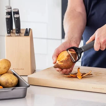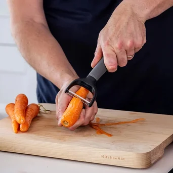 Obieraczka do warzyw z ostrzem ze stali nierdzewnej, które z łatwością obiera owoce i warzywa. Zarówno te twarde jaki miękkie. Dobrze wyważony, ergonomiczny uchwyt zapewnia wygodną i płynną pracę. W komplecie z obieraczką znajduje się nakładka ochronna na ostrze. Można myć w zmywarce.