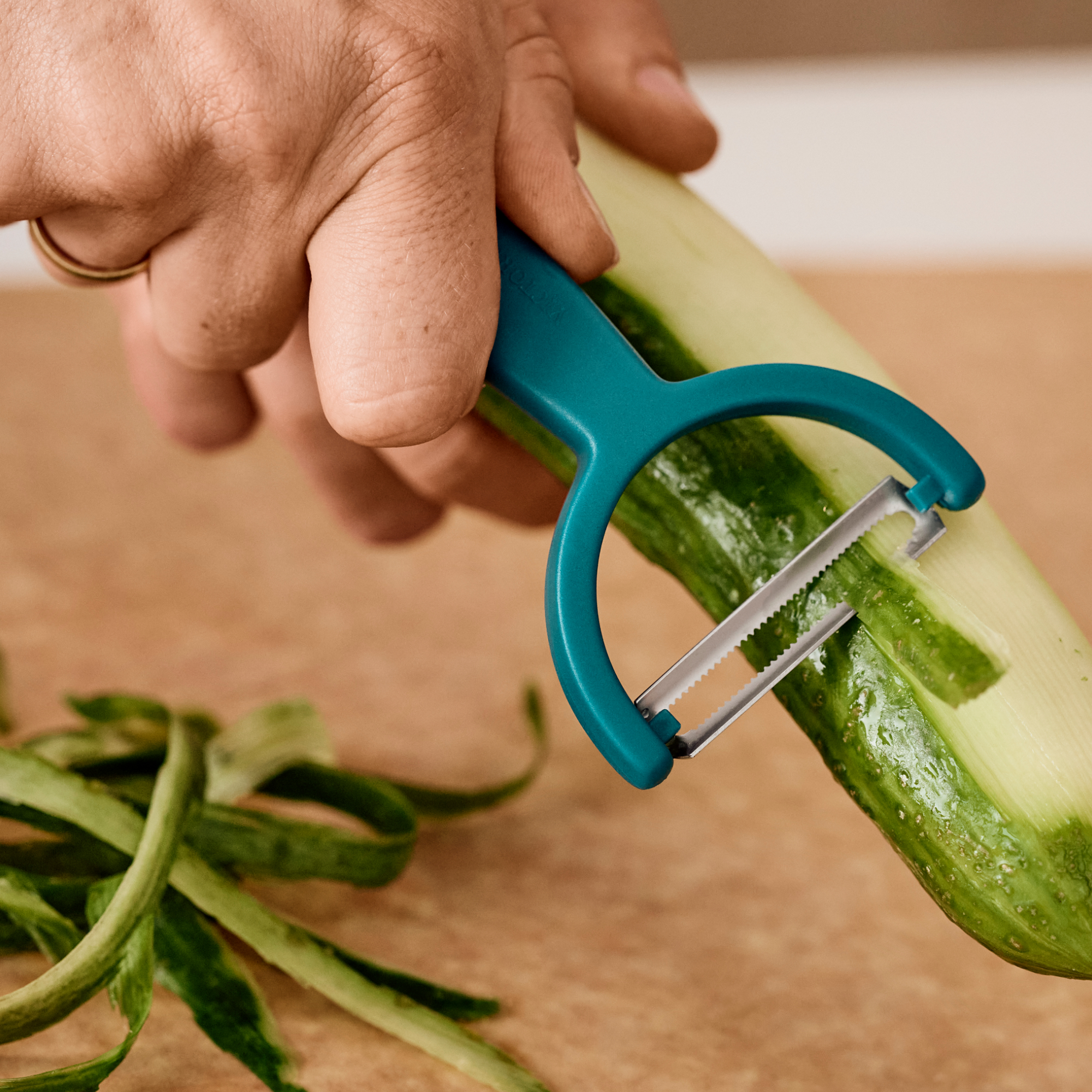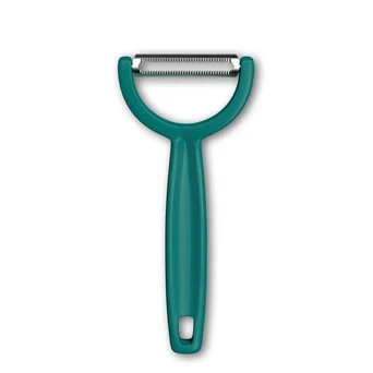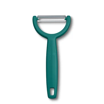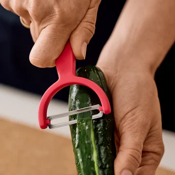 Obieraczka Ypso z ząbkowanym podwójnym ostrzem doskonale sprawdzi się podczas obierania podłużnych warzyw i owoców. Specjalnie skonstruowane ostrze obiera jedynie wierzchnią warstwę minimalizując odpad. Dzięki ząbkowanemu ostrzu obieranie trudnych powierzchni warzyw czy owoców, takich jak kiwi czy pomidor, nie będą stanowić problemu. Poziome ostrze sprawdzi się również przy dekoracyjnym skrawaniu płatów warzywnych.