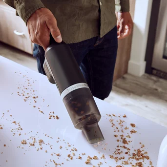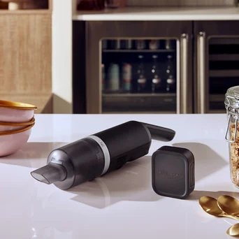 Bezprzewodowy odkurzacz kuchenny z kolekcji KitchenAid Go daje swobodę pracy bez kabla i pomaga zadbać o czystość na blacie i w innych kuchennych zakamarkach. Sprawdzi się także na kempingu lub ogrodowym stole po ucztowaniu w plenerze. Skutecznie usuwa wszelkie stałe zabrudzenia. Okruchy, fusy czy rozsypany cukier są bez szans. W zestawie z odkurzaczem znajduje się wymienna bateria, która może zasilać wszystkie urządzenia z systemu KitchenAid Go.