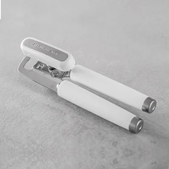 Otwieracz do puszek z wbudowanym otwieraczem do butelek. Wygodę użytkowania zapewniają wyprofilowane uchwyty i duże pokrętło do obracania tarczy tnącej ze stali nierdzewnej. Myć wyłącznie ręcznie, a po umyciu dokładnie osuszyć.