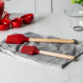 Przydatny pędzelek silikonowy z rączką z trwałego drewna brzozowego.Idealny do natłuszczania blach i form do pieczenia, smarowania patelni, gofrownic lub pokrywania mięs glazurą. Silikon odporny na temperaturę do 260ºC. Bezpieczny dla wszystkich powierzchni. Myć wyłącznie ręcznie ciepłą wodą i łagodnym płynem do mycia naczyń.