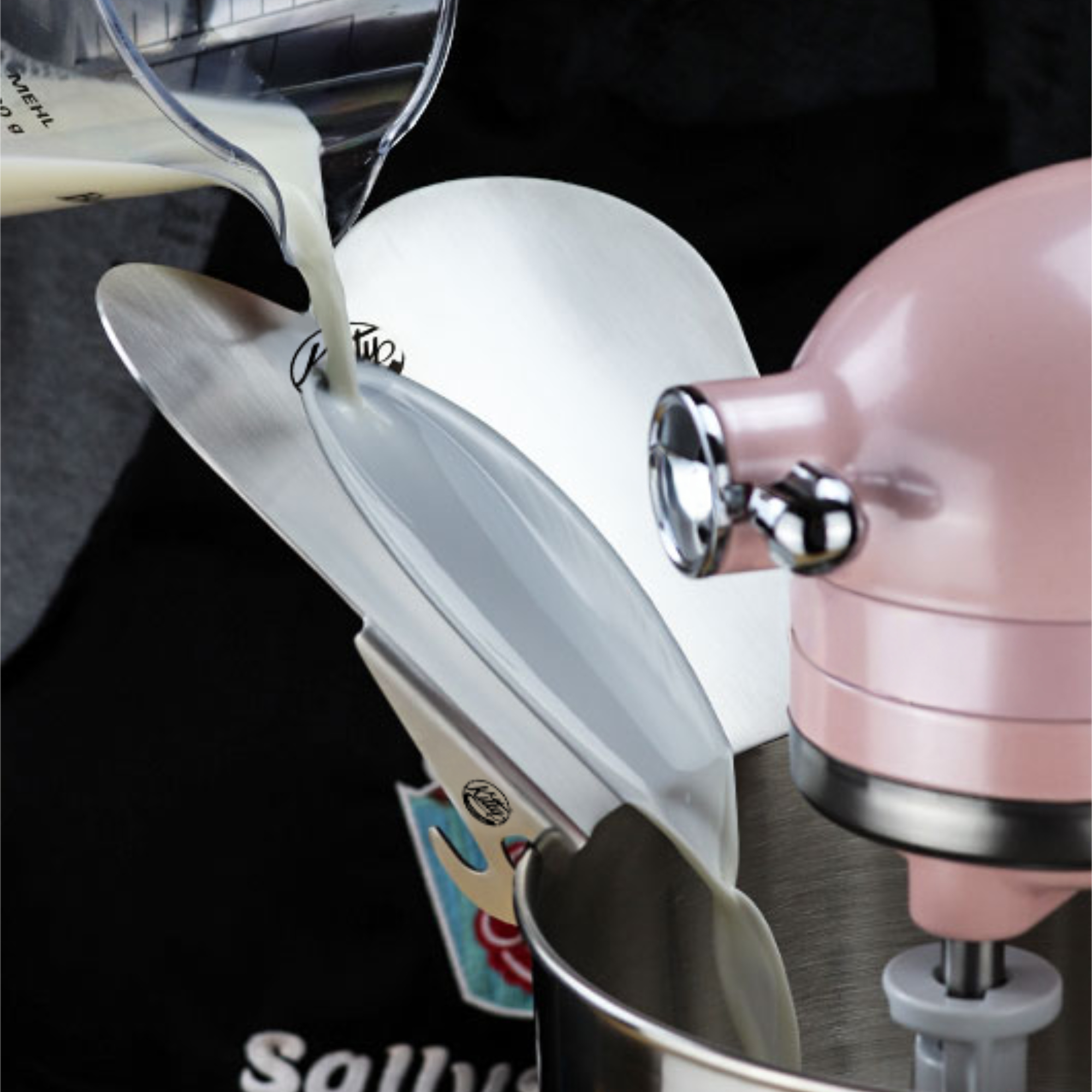 Suche składniki: mąka, cukier, przyprawy, nasiona – wszystko swobodnie spływa do misy. Płynne składniki: woda, mleko, olej – pełna kontrola wlewania. Solidna krawędź pozwala rozbijać jaja bezpośrednio nad nakładką.