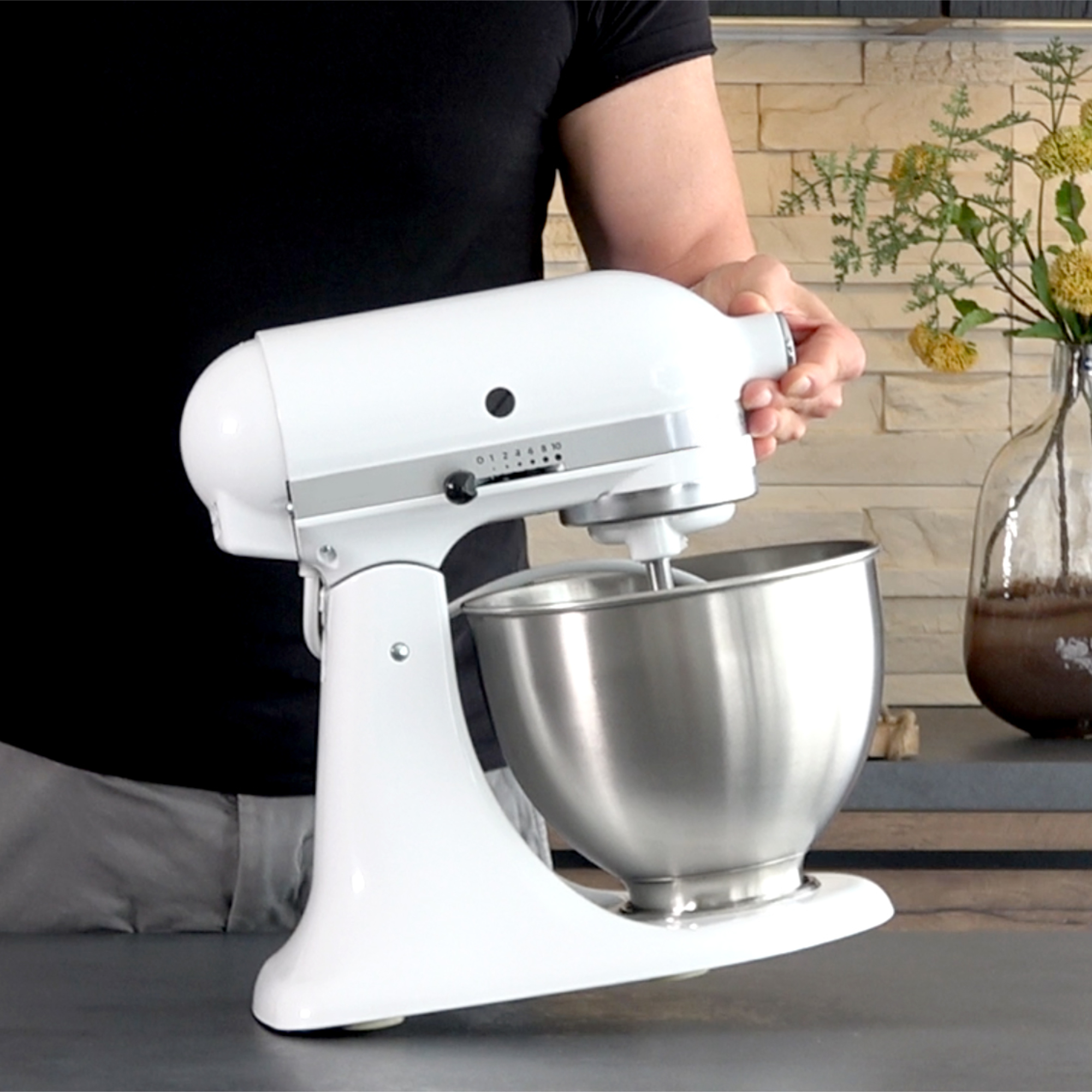 Wystarczy unieść mikser maksymalnie 2 cm z przodu w górę – przy mieszadle lub gnieździe akcesoriów. Tylna część opiera się na podkładkach ślizgowych. Urządzenie można teraz swobodnie przemieszczać w wybrane miejsce.