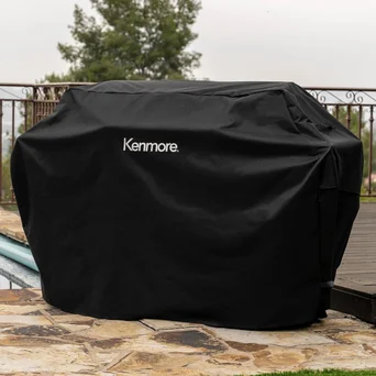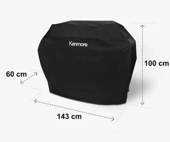 Pokrowiec na grilla Kenmore wykonany z wodoodpornego winylu i wytrzymałego poliestru. Pasuje do grilli z 4 palnikami - Kenmore Standard oraz Kenmore DeLuxe. Szczeliny wentylacyjne i paski zapinane na rzepy utrzymują pokrowiec na miejscu nawet przy wietrznej pogodzie, a uchwyty ułatwiają jego zakładanie i zdejmowanie.