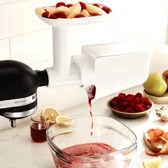 - lub przystawkę do przecierów (przecierak), po dołączeniu do korpusu maszynki akcesoriów do przecierów (5KSMFVSP), czyli długiego ślimaka, sitka stożkowego z łącznikiem i osłony przed pryskaniem soku.